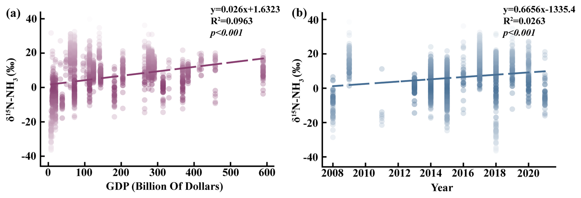 Ammonia emissions that contribute to urban smog primarily arise from combustion activities, vehicle exhaust, agriculture fertilization, and livestock production. As national economies expand, the frequency and severity of smog events have intensified. Figure 5a (slope: 0.026, intercept: 1.6323, R2: 0.0963) shows that from 2000 to 2025, when GDP remains below USD 70 billion, atmospheric δ15N-NH4+ signatures predominantly reflect fertilizer-derived emissions from agricultural regions and NH3 volatilization from livestock operations (Kawashima et al., 2022; Kawashima and Kurahashi, 2011). This pattern indicates that lower-income regions rely heavily on agriculture and animal husbandry as the foundational components of their economies (Leng et al., 2018).