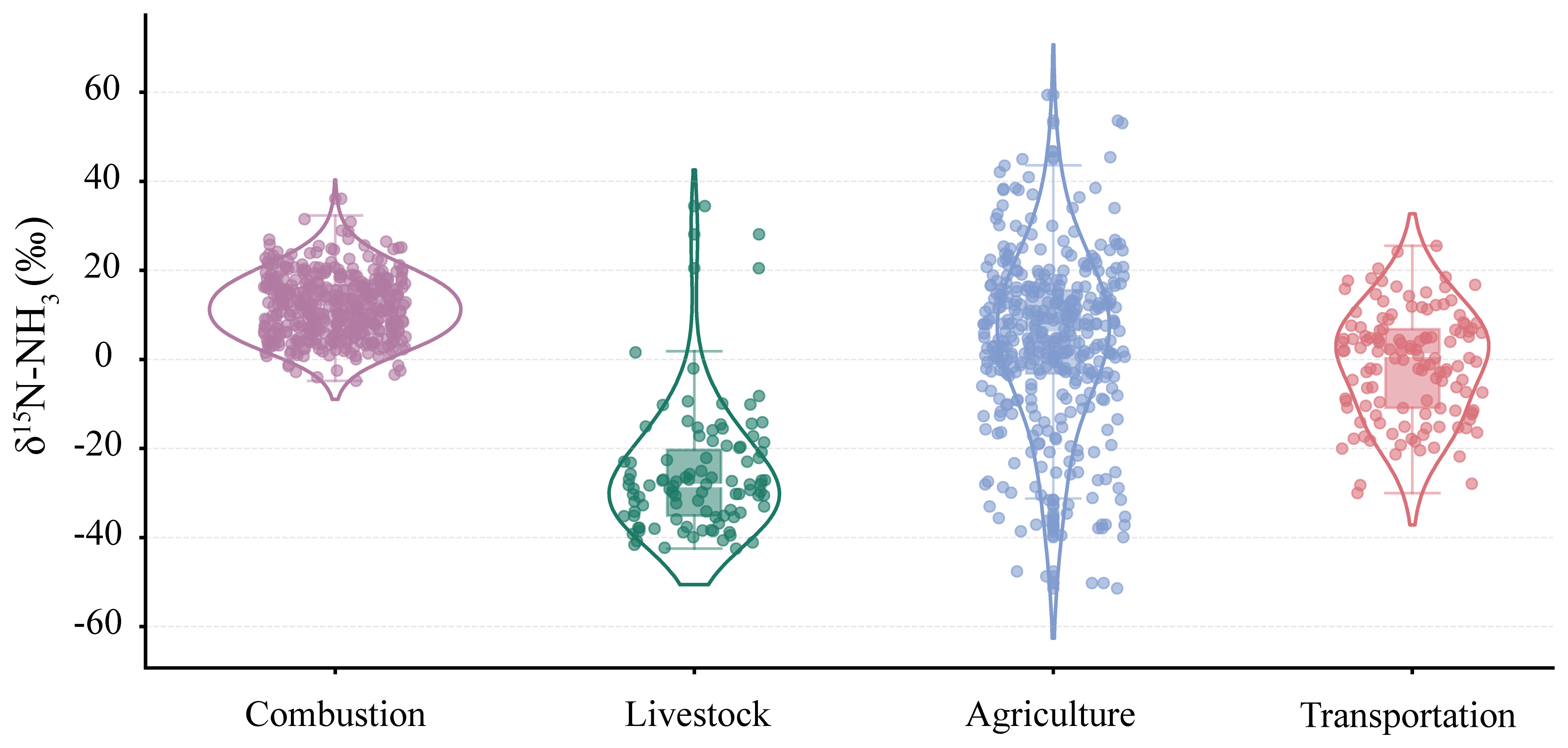 The extracted dataset was classified into four major emission categories-livestock farming, combustion, farmland fertilization, and vehicle exhaust-and subsequently subjected to statistical evaluation. As illustrated in Fig. 6, δ15N-NH4+ values associated with combustion sources showed strong consistency with previously reported ranges (Chang et al., 2021). Although traffic exhaust and livestock-related δ15N-NH4+ values exhibited moderate dispersion, both sources remained within relatively well-defined isotopic ranges. In sharp contrast, δ15N-NH4+ signatures following farmland fertilization displayed pronounced heterogeneity, covering nearly the entire isotopic spectrum reported for combustion, livestock, and vehicular emissions. This extensive variability highlights substantial regional differences in agricultural ammonia emission processes (Felix et al., 2014; Li et al., 2023b). Consequently, accurate source apportionment of atmospheric NH3 requires distinguishing dominant local emission pathways rather than relying solely on generalized isotopic patterns (Chen et al., 2022; Zhang et al., 2023).