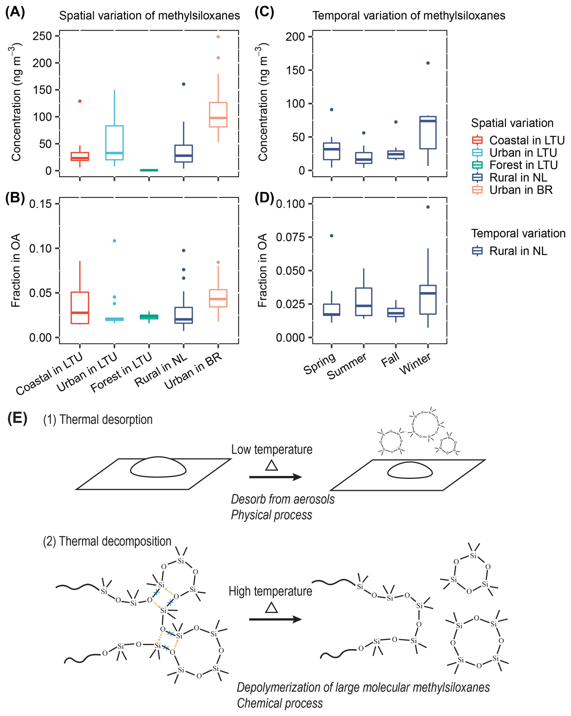 Although methylsiloxanes in atmospheric aerosols have been studied to some extent, knowledge about large molecular methylsiloxanes, compounds that only undergo thermal depolymerization at high temperatures, remains almost entirely lacking. To address this gap, we quantified particle-phase methylsiloxanes across a range of diverse environments, including coastal, urban, rural, and forest regions. Sampling locations were conducted in the Netherlands (West Europe), Lithuania (Northeastern Europe), and São Paulo in Brazil (South America). Concentrations of particle-phase methylsiloxanes and their mass fractions within non-refractory organic aerosols (OA) were determined in these diverse environments (Fig. 1a and b).