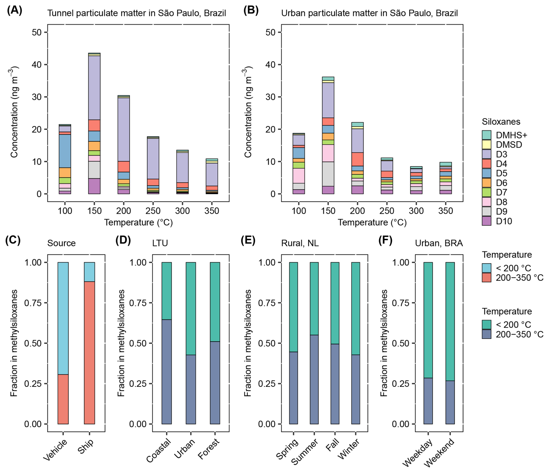 Overall, large molecular methylsiloxanes represent a substantial fraction of atmospheric aerosols in both Lithuania and the Netherlands, where 200–350 °C fractions already accounted for more than half of the total. This highlights that these newly identified large molecular methylsiloxanes are far more abundant than previously recognized gas-to-particle VMS. In São Paulo, the 200–350 °C fraction contributed more than one-quarter of the total, and depolymerization signatures of large molecular methylsiloxanes were already apparent at 150 and 200 °C, together accounting for over half of the total.