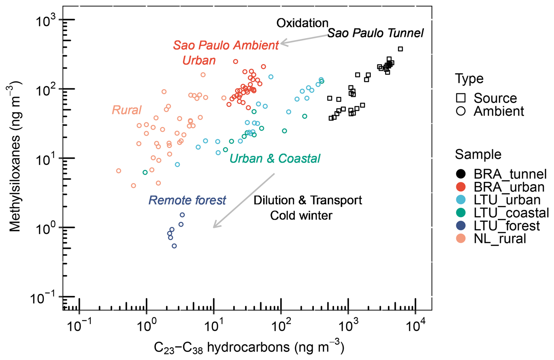 In Lithuania, atmospheric particulate matter was collected during a cold winter (average −4 °C). Despite the vastly different environments, methylsiloxanes and long-chain hydrocarbons showed similar correlations at urban, coastal, and forest sites, comparable to those observed in São Paulo tunnels. In contrast to São Paulo, the two compound classes decreased at comparable rates from polluted to clean sites, pointing to dilution as the dominant atmospheric process. The cold temperatures and weak solar radiation likely suppressed oxidation, allowing long-chain hydrocarbons to persist longer in ambient aerosols. At the rural background site in the Netherlands, methylsiloxanes levels were of the same order of magnitude (or slightly lower) than in Lithuania, while long-chain hydrocarbons reached their lowest concentrations across all sites, suggesting stronger oxidative loss under milder climatic conditions.