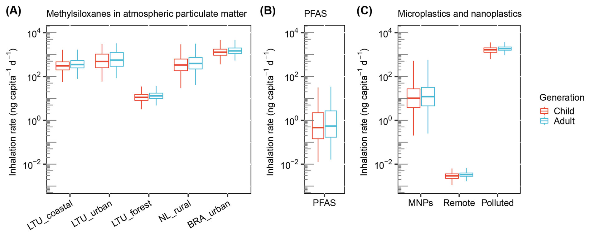 Our results show that inhalation rates of particle-phase methylsiloxanes vary substantially across environments (Fig. 4a). In Lithuania's forested areas, median daily intakes were 11.3 ng per capita per day for children and 13.0 ng per capita per day for adults, while in urban Brazil, values reached 1290 and 1480 ng per capita per day, respectively. Given the strong association of large molecular methylsiloxanes with traffic emissions, these results suggest that human exposure is a widespread and potentially significant issue on a global scale.