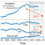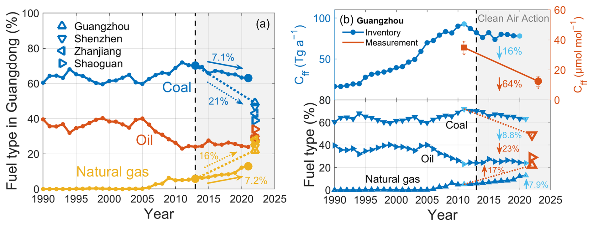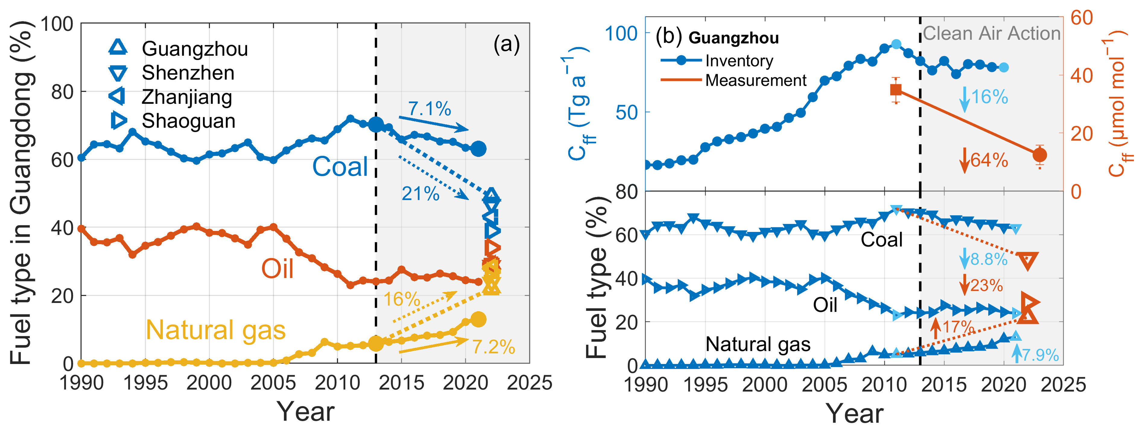 Figure 5(a) Coal, oil, and natural gas fractions of Cff in Guangdong Province from the MEIC inventory from 1990–2021 (points), and in the cities of Guangzhou, Shenzhen, Zhanjiang, and Shaoguan from measurements in this study in 2022 (triangles). (b) (Top) Comparison of reductions in Cff inventory emissions (blue) and harmonized measured Cff concentrations in Guangzhou (red; harmonized by applying consistent sampling-time and background assumptions) resulting from (Bottom) reduced coal usage and increased natural gas usage in Guangzhou. The vertical dashed line indicates the year 2013 when China's Clean Air Action Plan was implemented.