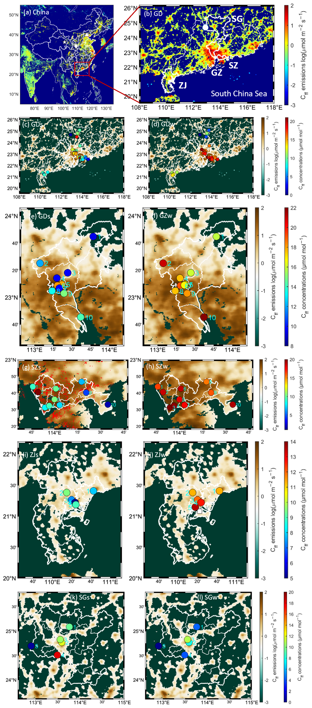 Figure 1Locations of sampling sites and spatial distribution of Cff concentrations during summer (s) and winter (w) in (c, d, GD) Guangdong Province and the cities of (e, f, GZ) Guangzhou, (g, h, SZ) Shenzhen, (i, j, ZJ) Zhanjiang, and (k, l, SG) Shaoguan. White-filled symbols denote Beijing (), Xi'an (), and Waliguan () in (a); Nanling () in (b); Shenzhen Airport () in (g); and Zhanjiang Port () in (j). Shenzhen's industrial land use (https://download.geofabrik.de/asia/china.html, last access: 11 November 2025) is shown as red in (g), with the spatial distribution of all industrial enterprises and CO2-emitting facilities documented in Li et al. (2025a). Colored circles in (c)(l) represent the observations, while the shading indicates the Cff inventory emissions from the Open-source Data Inventory for Anthropogenic CO2 (ODIAC) (Oda and Maksyutov, 2024) in August and December with 1 km×1 km grid spacing. White lines indicate boundaries of cities in Guangdong Province (c, d), and boundaries of districts in the four cities (e–l). In (c)(d), bold white lines indicate boundaries of nine cities of the Pearl River Delta. The left color bar represents the Cff inventory emissions, while the right color bar represents the Cff observations.