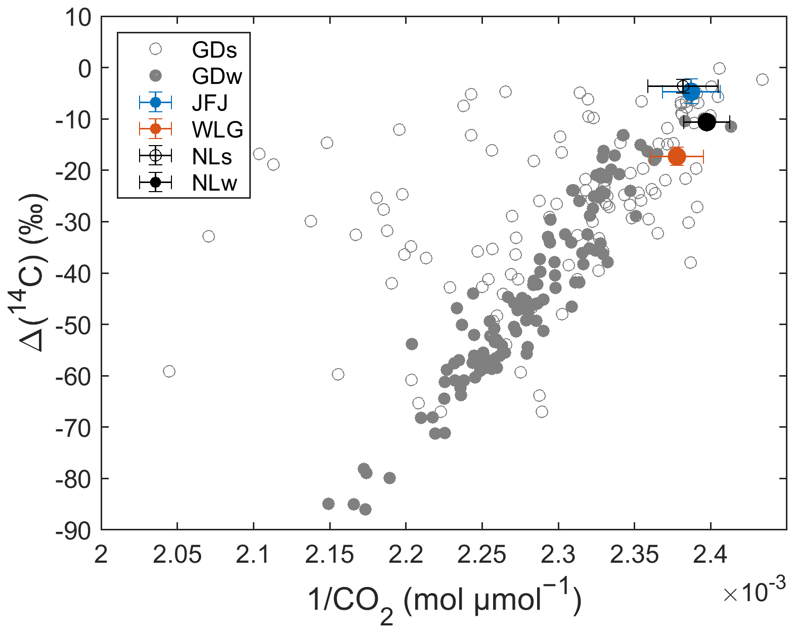 Figure 2Keeling plot of CO2 and Δ(14C) measurements from Guangdong Province in summer (GDs) and winter (GDw), and background stations including JFJ (Jungfraujoch) (Emmenegger et al., 2024a, b), WLG (Waliguan) (Liu et al., 2024; Lan et al., 2024), and NL (Nanling, this study) in 2022. For the JFJ background site, the complete 2022 dataset was used to calculate a true annual mean. For the WLG background site, CO2 concentrations were obtained from the World Data Centre for Greenhouse Gases (WDCGG, https://gaw.kishou.go.jp/, last access: 21 April 2024), while Δ(14C) observations were obtained from Liu et al. (2024). For the NL background site, CO2 and Δ(14C) observations were obtained from two campaigns in August and December 2022, representing typical summer and winter conditions.