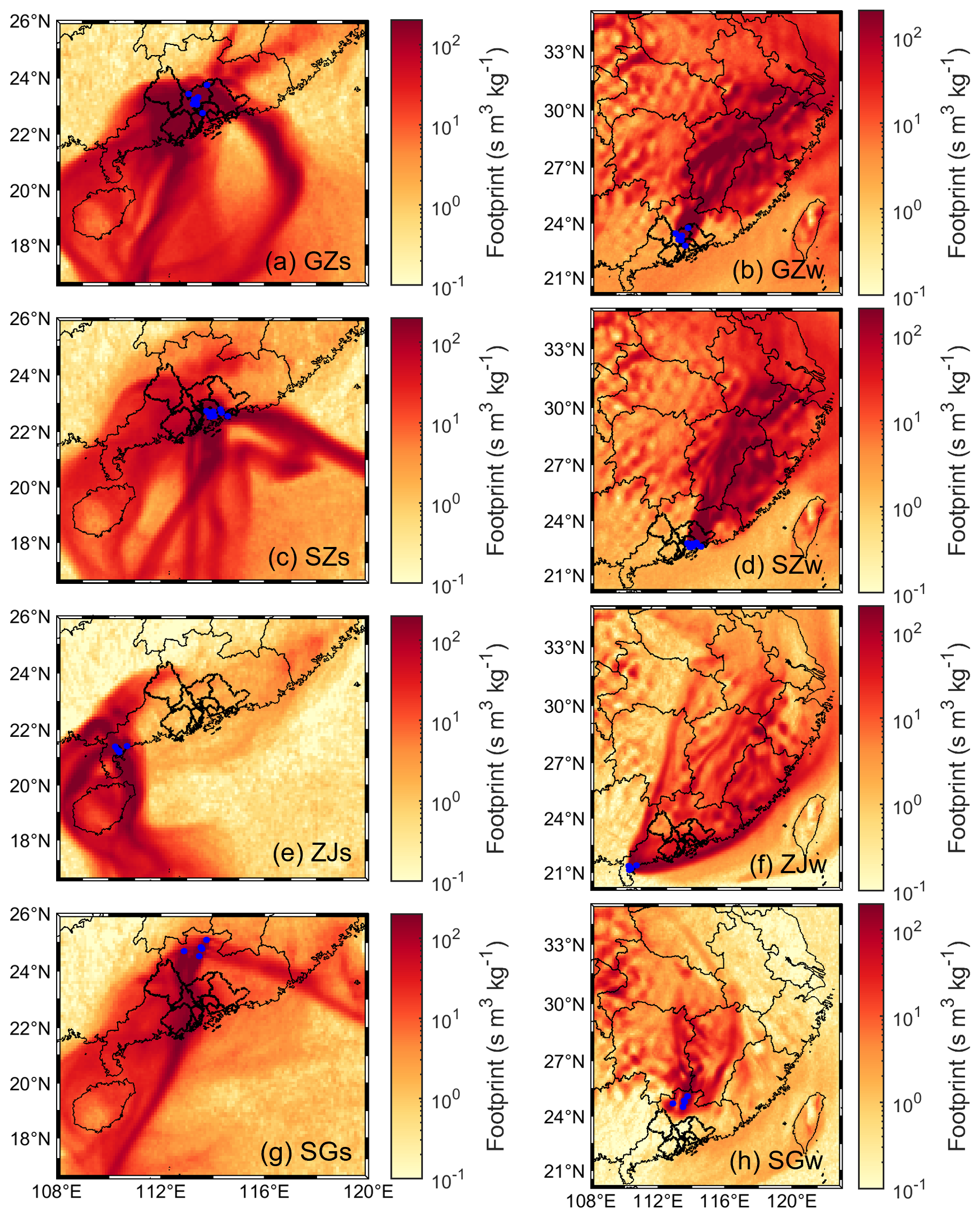 Figure 3FLEXPART footprints simulating Cff emissions in summer (s) and winter (w) for (a, b, GZ) Guangzhou, (c, d, SZ) Shenzhen, (e, f, ZJ) Zhanjiang, and (g, h, SG) Shaoguan at heights from 0–100 m a.s.l. over a period of 30 d. Blue points represent the locations of sampling sites. Black lines indicate the boundaries of continents (left), Chinese provinces (left, bold), and the nine cities of the PRD (right, bold) taken from Natural Earth (https://www.naturalearthdata.com/, last access: 9 March 2024).
