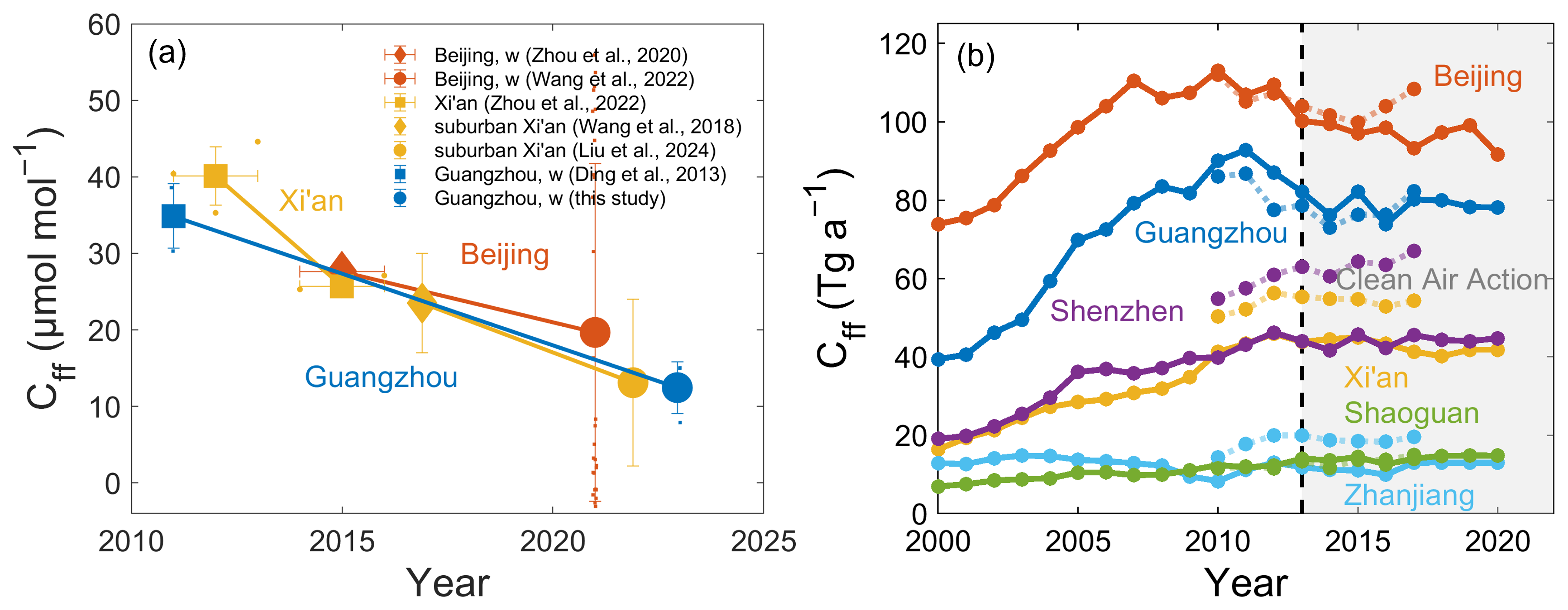 Figure 4(a) Harmonized comparison of Cff mole fractions at the same sites and seasons, after applying consistent sampling time and background assumptions. Cff concentrations are compiled from atmospheric measurements (Wang et al., 2022b; Zhou et al., 2022, 2020; Ding et al., 2013; Wang et al., 2018) in Beijing, Xi'an, and Guangzhou. Large symbols indicate annual means, multiyear averages, or winter means (w) of the harmonized Cff values listed in Table H2; small symbols represent the corresponding individual measurements. Cff is calculated as enhancements over the regional background (Nanling for Guangzhou; Waliguan for Beijing and Xi'an). For Guangzhou, the inter-study harmonization in Table H2 uses a common NL tree-ring Δ(14C) reference baseline (growing-season integrated; extrapolated to 2022 from the 2011–2020 record; Li et al., 2025b) to harmonize background definitions across studies (used for harmonization only, not as a winter background). The y axis error bars indicate uncertainty, and the x axis error bars represent the observed period. (b) Cff emissions from the MEIC (solid lines) (Li et al., 2017; Meic, 2023; Zheng et al., 2018) and MIXv2 (dotted lines) (Li et al., 2024) inventories in Beijing, Xi'an, Guangzhou, Shenzhen, Zhanjiang, and Shaoguan since 2010. The vertical dashed line indicates the year 2013 when China's Clean Air Action Plan was implemented.