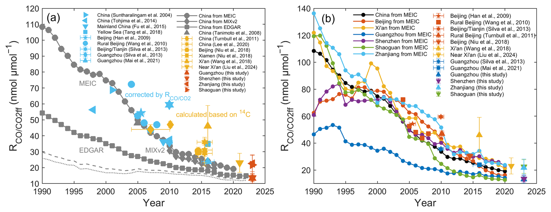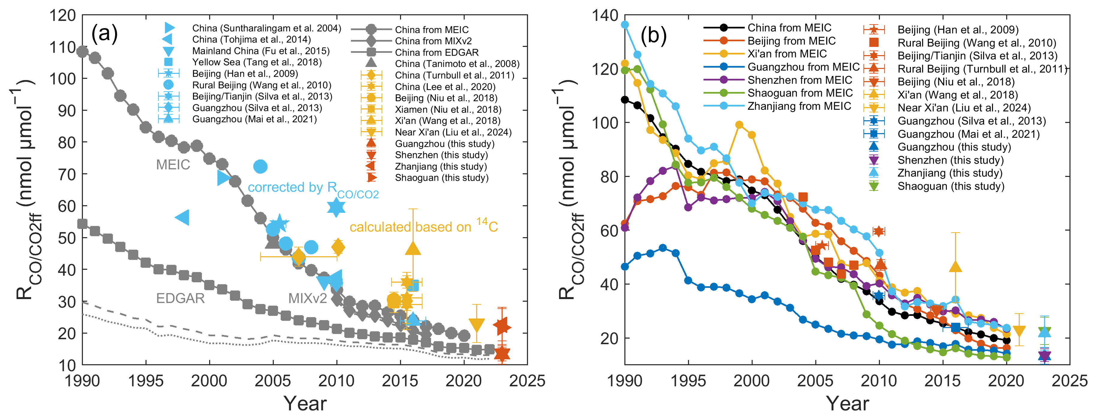 Figure 6RCO/CO2ff for (a) China and for (b) Chinses cities obtained from inventories and observations (values refer to Table H1). For (a), the gray symbols represent data from the emission inventories (Tanimoto et al., 2008), including MEIC (Meic, 2023; Xu et al., 2024; Li et al., 2019, 2017), MIXv2 (Li et al., 2024), and EDGAR2024 (EDGAR, 2024). The ICO/CO2ff emission ratios derived from the three inventories are shown with distinct approaches: (1) MEIC calculated the ICO/CO2ff ratio for all anthropogenic sectors (represented by solid line with point symbols); (2) MIXv2 computed two variants: combining anthropogenic sectors with open biomass burning (solid line with diamond symbols) and anthropogenic-only emissions (dash-dotted line); while (3) EDGAR2024 provided three ratios: fossil + biogenic CO (solid line with square symbols), fossil + biomass burning CO (dashed line), and fossil-only CO (dotted line), all relative to Cff emissions. The light blue symbols represent RCO/CO2ff corrected by RCO/CO2 from observational studies (Wang et al., 2010; Tohjima et al., 2014; Suntharalingam et al., 2004; Tang et al., 2018; Han et al., 2009; Fu et al., 2015), assuming that 20 % of the CO2 enhancement was from sources other than Cff. The orange symbols represent RCO/CO2ff calculated based on atmospheric 14CO2 measurements from previous studies (Turnbull et al., 2011; Niu et al., 2018; Lee et al., 2020; Wang et al., 2018; Liu et al., 2024). The red symbols depict the values observed in this study. For (b), the Chinese cities include Beijing, Xi'an, Guangzhou, Shenzhen, Zhanjiang, and Shaoguan from the MEIC inventory (filled circles) and observations from previous studies (Wang et al., 2018, 2010; Liu et al., 2024; Silva et al., 2013; Niu et al., 2018; Mai et al., 2021; Han et al., 2009; Turnbull et al., 2011) and this study since 1990. The up and down triangles represent RCO/CO2ff estimated based on atmospheric Δ(14CO2) measurements. Other symbols represent the RCO/CO2ff corrected by RCO/CO2 from observational studies, assuming that 20 % of the CO2 enhancement is from sources other than Cff. For observation-based RCO/CO2ff, vertical error bars denote the uncertainty of the fitted ΔCO-Cff regression slope. Horizontal error bars indicate the time span of each observation period, and the symbol is plotted at the median time.