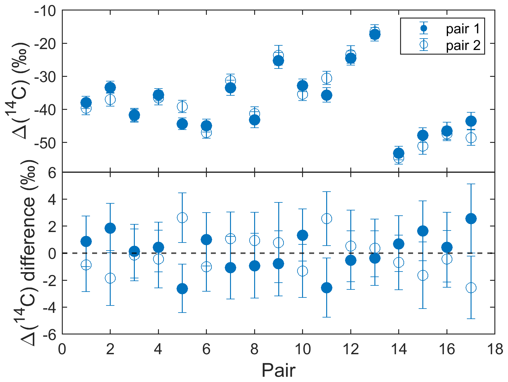 The residual air samples were transferred into a vacuum system at a flow rate of 300 mL min−1. It was then first passed through a cold trap consisting of dry ice and ethanol slurry to freeze out water, followed by passage through a liquid nitrogen cold trap (−196 °C) to freeze down the CO2 (Xu et al., 2007). The extracted and purified CO2 was converted into graphite using the hydrogen reduction method. The graphite was then pressed into an aluminum holder for 14C measurements using an NEC 0.5MV 1.5SDH-2 accelerator mass spectrometer (AMS, National Electrostatics Corporation, USA) (Zhu et al., 2015). Each measurement wheel typically comprises 13 primary standards (oxalic acid II), 13 sary standards (IAEA-C7), 13 solid process blanks (p-phthalic acid), 6 gas process blanks (14C-free CO2 in synthetic air from a cylinder), and some authentic air samples. The results are presented as Δ(14C), which is the per mill (‰) deviation from the absolute radiocarbon reference standard, corrected by fractionation and decay Stuiver and Polach, 1977). We analyzed 17 pairs of parallel air samples to evaluate the quality control and assurance of the entire sampling and laboratory analysis process, including sampling, extraction, graphitization, and AMS measurement. The AMS measurement uncertainty and the average deviation are (2.1±0.3) ‰ and (0.2±2.9) ‰, respectively (see Fig. A1). We thus specify a one-sigma measurement uncertainty of 2.9 ‰ for Δ(14C) based on these repeat measurements of air samples.