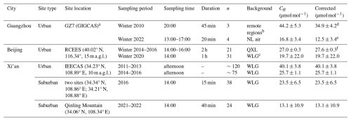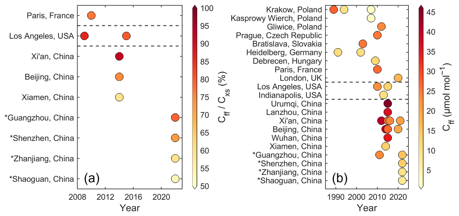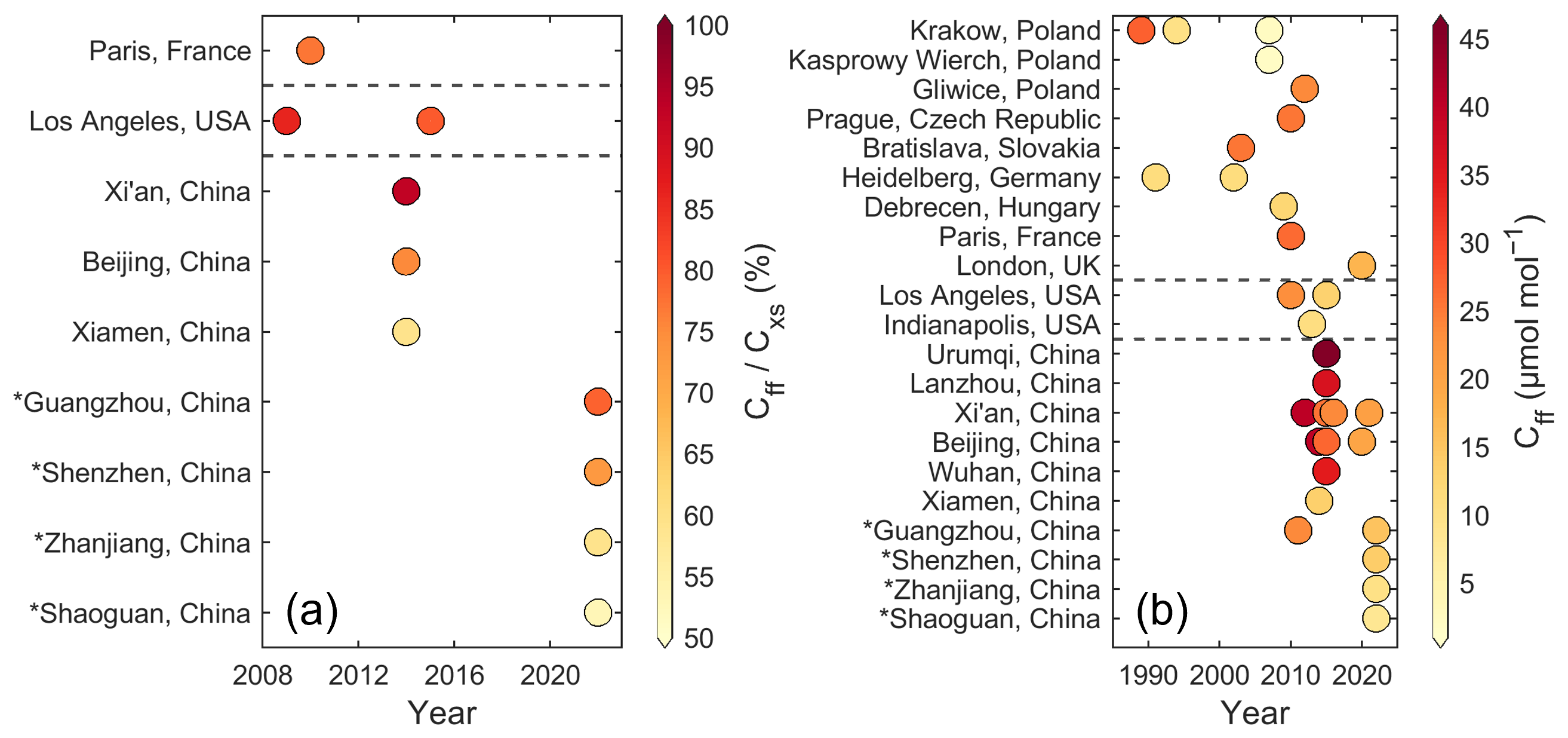 Comparable harmonized analyses were performed for other Chinese cities (Tables H1 and H2; Fig. 4a). For Beijing, all measurements originate from the urban rooftop site of the Research Center for Eco-Environmental Sciences, Chinese Academy of Sciences (RCEES). The Δ(14C) background used in Zhou et al. (2020) was based on Qixianling Mountain (QXL), whereas Wang et al. (2022b) adopted the Waliguan (WLG) background. All Cff values were recalculated using WLG as a common reference background with the 2015 value from Niu et al. (2016). After this correction, the 2014–2016 winter Cff value increases slightly from 27.0±0.3 to 27.6±0.3µmolmol-1, ensuring consistency across datasets. Relative to this harmonized baseline, the subsequent decline to 19.7±22.0 µmol mol−1 by winter 2020 (Wang et al., 2022b) represents an approximate 29 % reduction (p<0.05). This trend is consistent with regional fossil-fuel CO2 emission reductions and corroborated by independent Δ(14C) tree-ring records showing a peak near 2010 in Beijing (Niu et al., 2024). For Xi'an, at the Institute of Earth Environment, Chinese Academy of Sciences (IEECAS) urban site, Cff fell by 36 % from (40.1±3.8)µmolmol-1 in 2011–2013 to (25.7±1.1)µmolmol-1 in 2014–2016 (p<0.001) (Zhou et al., 2022). Suburban sites declined by ≈12 % from (23.5±6.5)µmolmol-1 in 2016 (Wang et al., 2018) to (13.1±10.9)µmolmol-1 in 2021–2022 (Liu et al., 2024) (p<0.05). These decreases are consistent with independent Δ(14C) tree-ring records indicating emission peak near 2013 in Xi'an (Niu et al., 2024).
