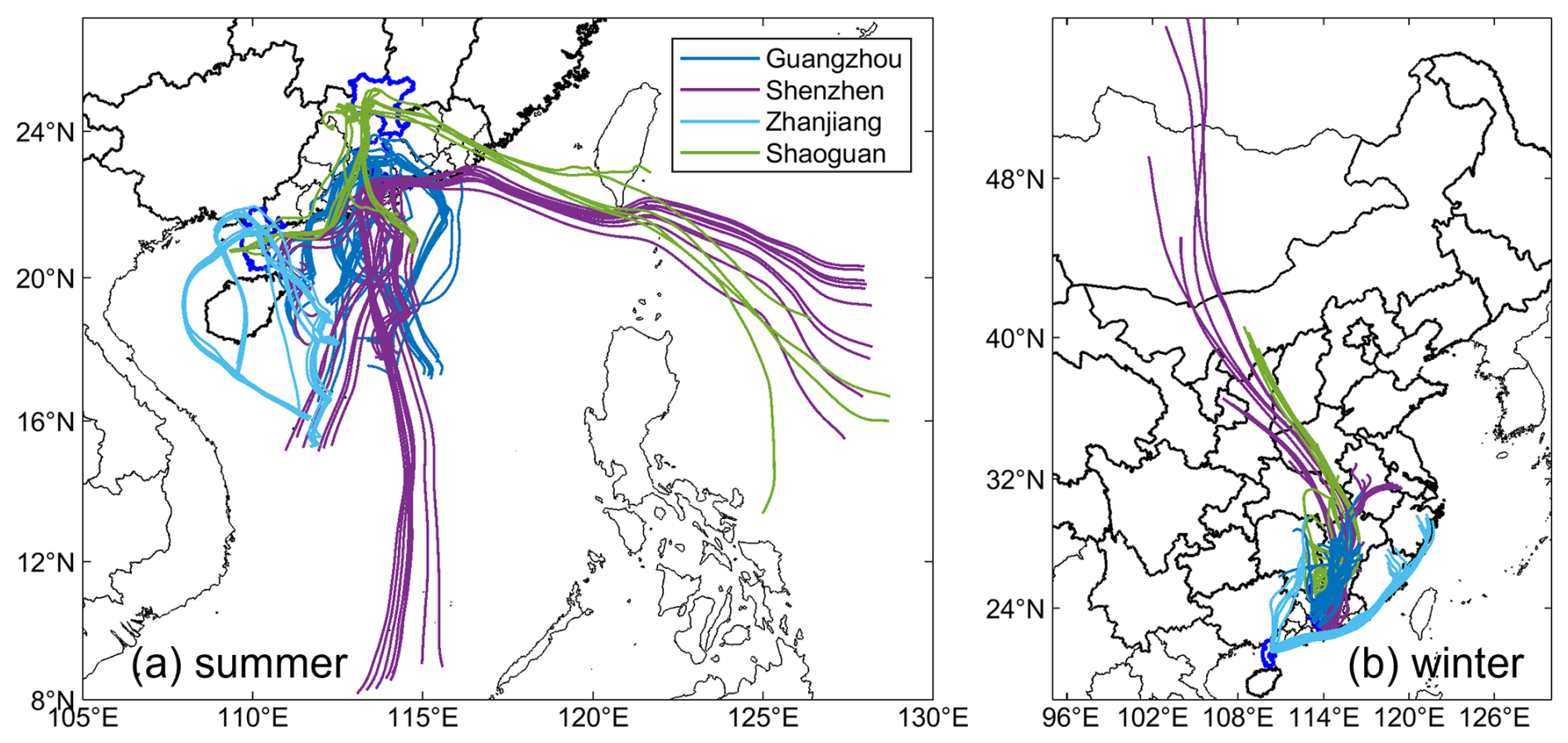 Atmospheric transmission of Cff from potential source regions was observed at large spatial scales combined with air mass back trajectories by the Hybrid Single-Particle Lagrangian Integrated Trajectory (HYSPLIT) model (Stein et al., 2015) and emission footprints by the FLEXPART dispersion model (Pisso et al., 2019). Shaoguan exhibited higher Cff concentrations in summer ((10.7±8.3)µmolmol-1) than in winter ((5.8±4.4)µmolmol-1). Trajectory and footprint analyses suggest that summer observations at Shaoguan were frequently influenced by air masses arriving from the Pearl River Delta (PRD) urban agglomeration (HYSPLIT, Fig. F1a; FLEXPART, Fig. 3g), consistent with a larger upwind contribution under prevailing transport conditions. We note that the inference of “local versus non-local” contributions is conditional on the completeness and spatial allocation of the emission inventories. In contrast, we found higher Cff concentrations in winter compared with those in summer in Guangzhou ((17.7±3.5)>(12.9±5.6)µmolmol-1), Shenzhen ((18.0±9.9)>(9.2±8.5)µmolmol-1), and Zhanjiang ((12.1±5.1)>(7.6±4.3)µmolmol-1), consistent with the values in 14 other Chinese cities (Zhou et al., 2020). The higher winter concentrations likely reflect a combination of (i) reduced ventilation (e.g., a shallow planetary boundary layer), and (ii) higher wintertime emissions suggested by ODIAC/MEIC (winter emissions 8 %, 10 %, and 11 % [ODIAC] and 17 %, 22 %, and 14 % [MEIC] higher than summer for Guangzhou, Shenzhen, and Zhanjiang, respectively (Oda and Maksyutov, 2024; MEIC, 2023)), noting the associated inventory uncertainties. Within Guangzhou (GZw) and Shenzhen (SZw), wintertime spatial gradients show higher Cff concentrations at downwind sites (GZ2, GZ6, and GZ10; SZ3 and SZ4) than at upwind sites (GZ1 and GZ3; SZ8 and SZ9), suggesting an important role of transport/accumulation in shaping the observed enhancements. The air mass back trajectories (HYSPLIT, Fig. F1b) and emission footprints (FLEXPART, Fig. 3b and d) showed that the major source region was traced to the Yangtze River Delta (YRD) urban agglomeration in East China, and a portion from North China via long-range transport (Fig. F2e and f). The major source region from the YRD was also reported in a study of CFC-11 in Shenzhen (Chen et al., 2024).