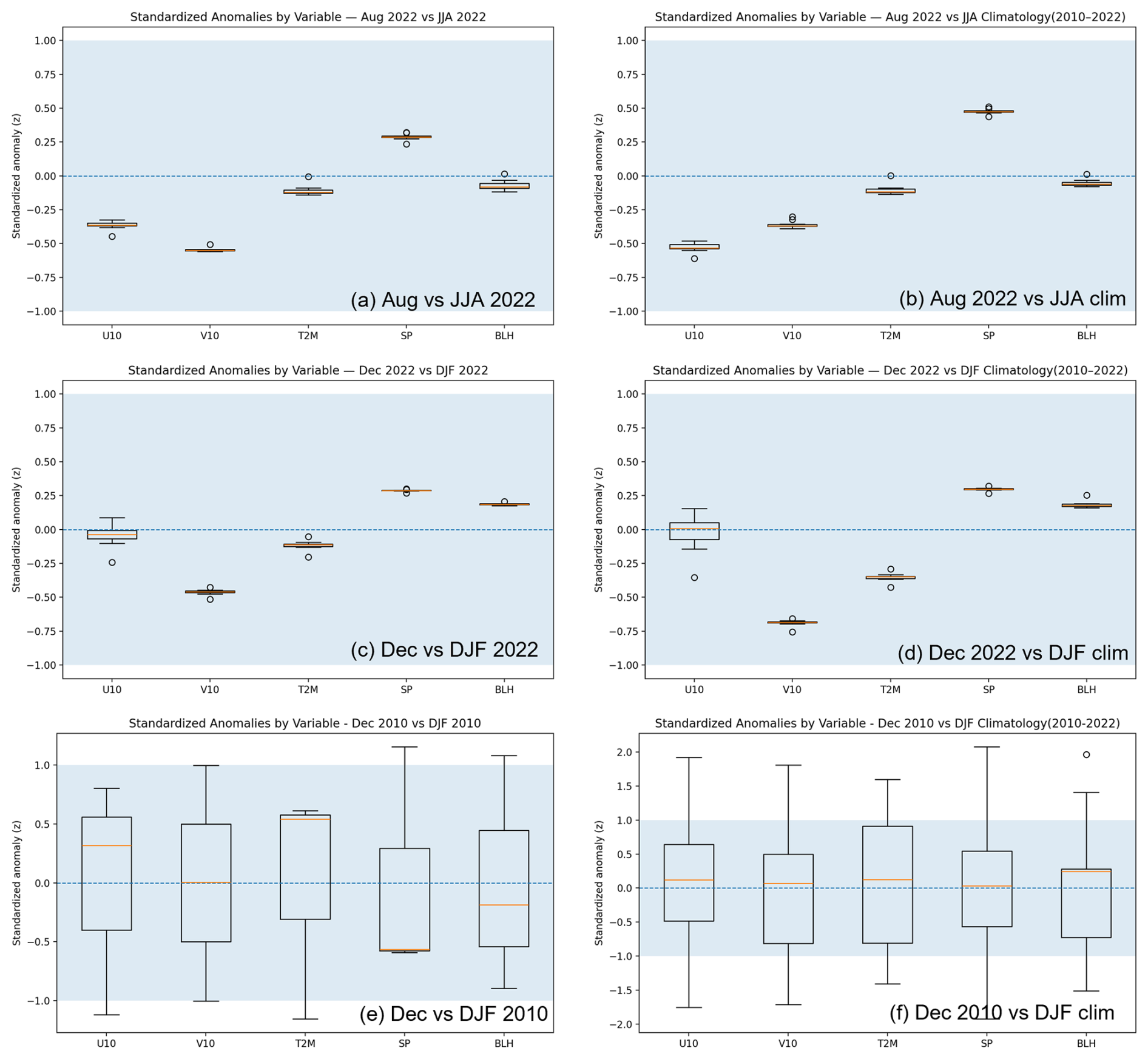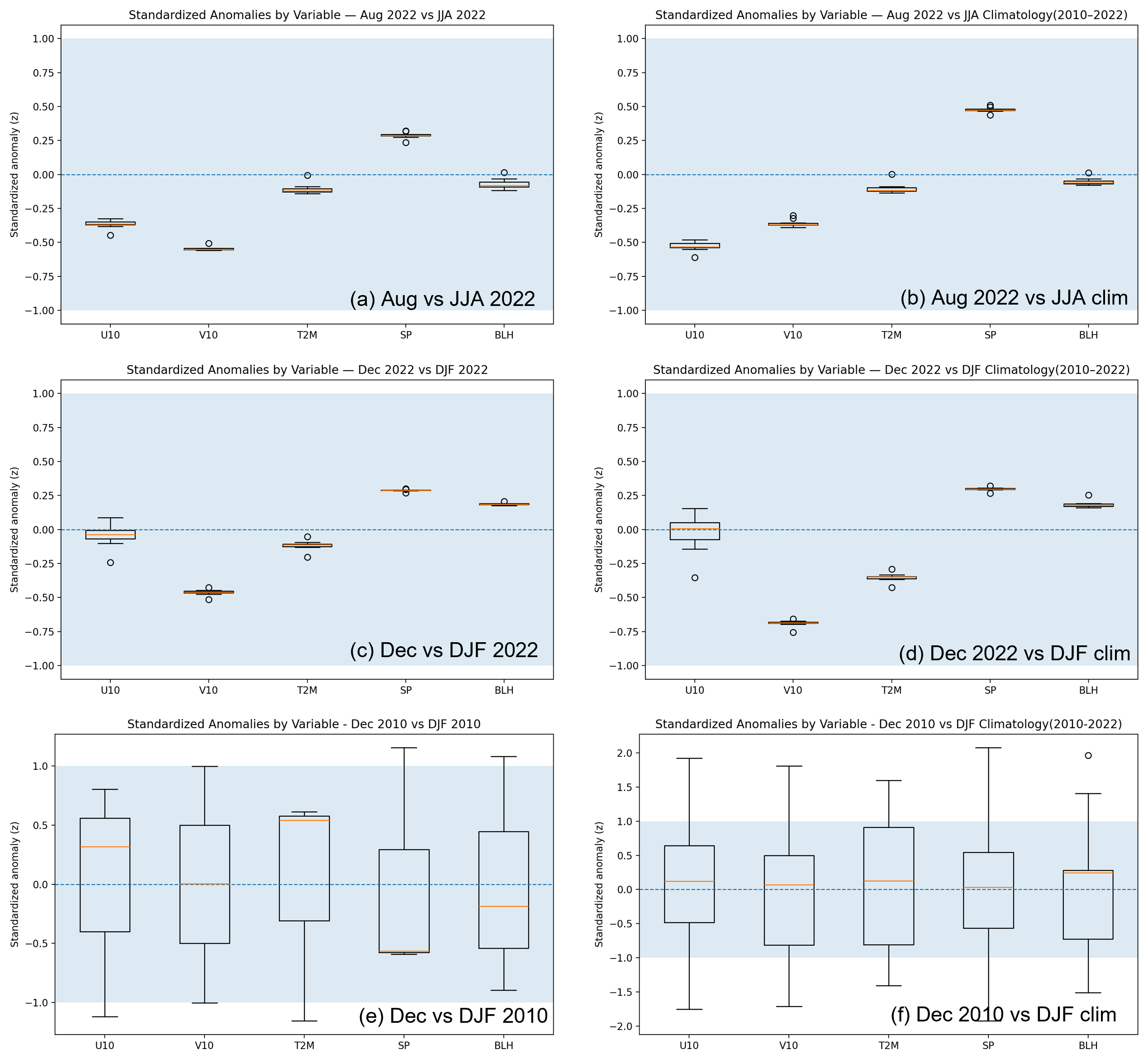 We collected 240 air samples from 30 sites during summer (28 July–30 August 2022) and winter (12 December 2022–6 January 2023) campaigns, with weekly sampling in both periods. Because atmospheric transport variability can influence observed Cff signals, we evaluated the meteorological representativeness of the sampling months using ERA5 diagnostics and trajectory analyses. Specifically, we assessed whether the August and December 2022 flask measurements were representative of typical summer and winter transport conditions. Standardized anomalies (z=(xtarget-μseason)/σseason) were calculated for five ERA5 meteorological variables: 10 m eastward wind (U10), 10 m northward wind (V10), 2 m air temperature (T2M), surface pressure (SP), and planetary boundary-layer height (PBLH). Each target month was compared against (i) the concurrent 2022 seasonal background (June–July–August, JJA; December–January–February, DJF) and (ii) the 2010–2021 seasonal climatology. The choice of 2010 as the starting year ensures consistency with the earlier dataset from 2010, which is directly compared in this study. A month was considered “typical” when |z1 and its dominant wind direction fell within the canonical summer (90–225°) or winter (0–45°) monsoon sectors.