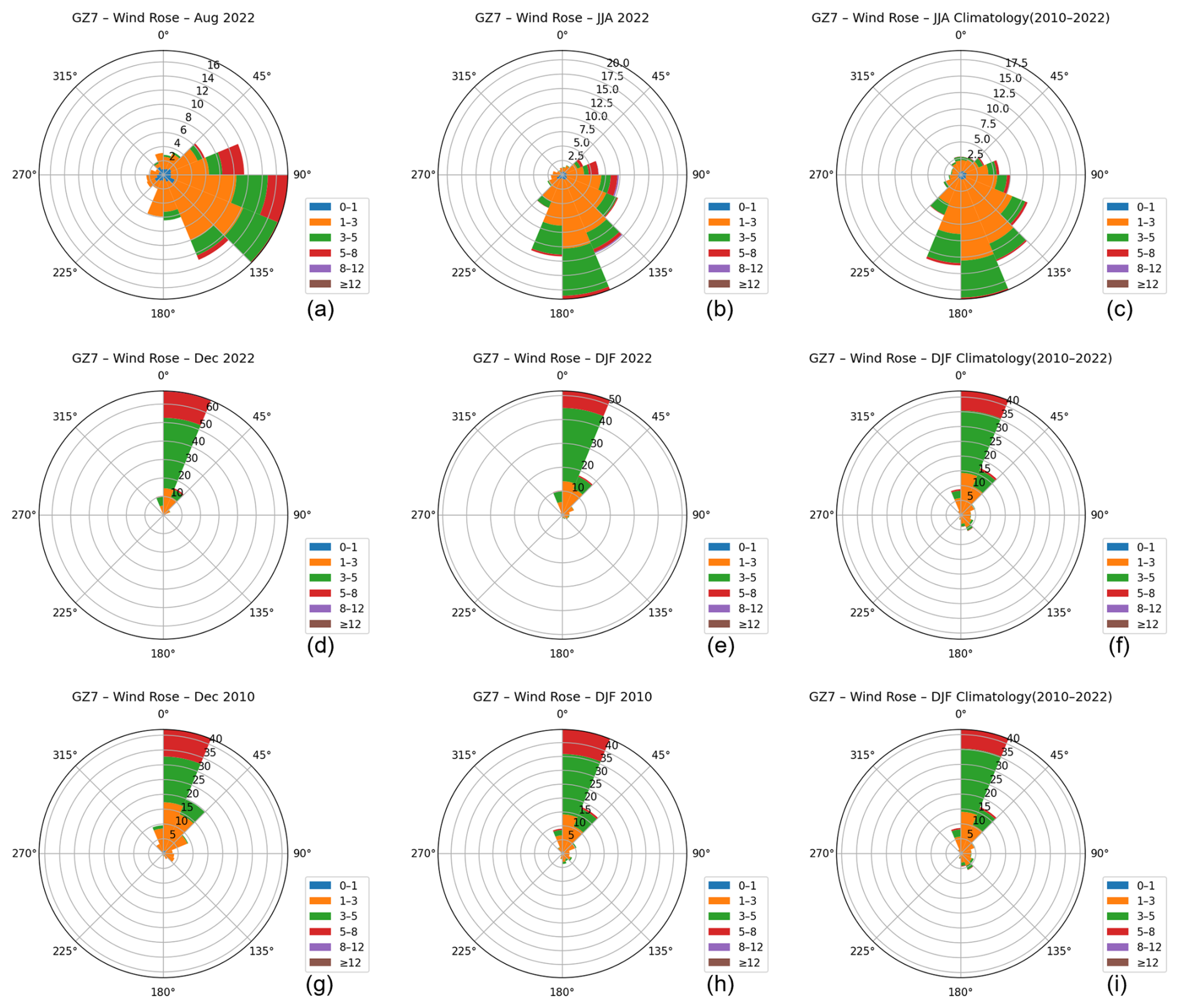 Complementary ERA5 wind-rose analyses (Fig. G2) and 72 h HYSPLIT back-trajectory simulations (Fig. F1) confirm that both months followed the canonical East Asian monsoon regimes – maritime inflow during summer and continental outflow during winter. Using GZ7 as an illustrative example representative of central Guangzhou, the ERA5 wind roses show dominant east–east-southeasterly (90–135°) winds in August 2022, typically 3–8 m s−1. In comparison, JJA 2022 and the 2010–2021 JJA climatology peak in the south–south-westerly sector (157.5–225°), representing a within-sector rotation (90–225°) rather than a regime change. ERA5 anomalies of U10, V10, and PBLH remain below 1σ, confirming transport typicality. HYSPLIT trajectories indicate that August 2022 air masses primarily originated over the South China Sea, consistent with summer maritime inflow. For December 2022, the ERA5 wind roses display a clear north–north-easterly (0–45°) dominance with 3–8 m s−1 speeds. The DJF 2022 composite and the 2010–2021 DJF climatology show nearly identical northerly continental patterns, typical of the East Asian winter monsoon. HYSPLIT back trajectories confirm that the air parcels predominantly arrived from northern continental China under prevailing northerlies. Similarly, the ERA5 wind roses for December 2010 and DJF 2010 at GZ7 (Fig. G2g–h) show dominant northerly to north-easterly flow, closely matching the DJF climatological wind regime, indicating that the 2010 winter sampling period was also embedded in the canonical East Asian winter monsoon pattern.