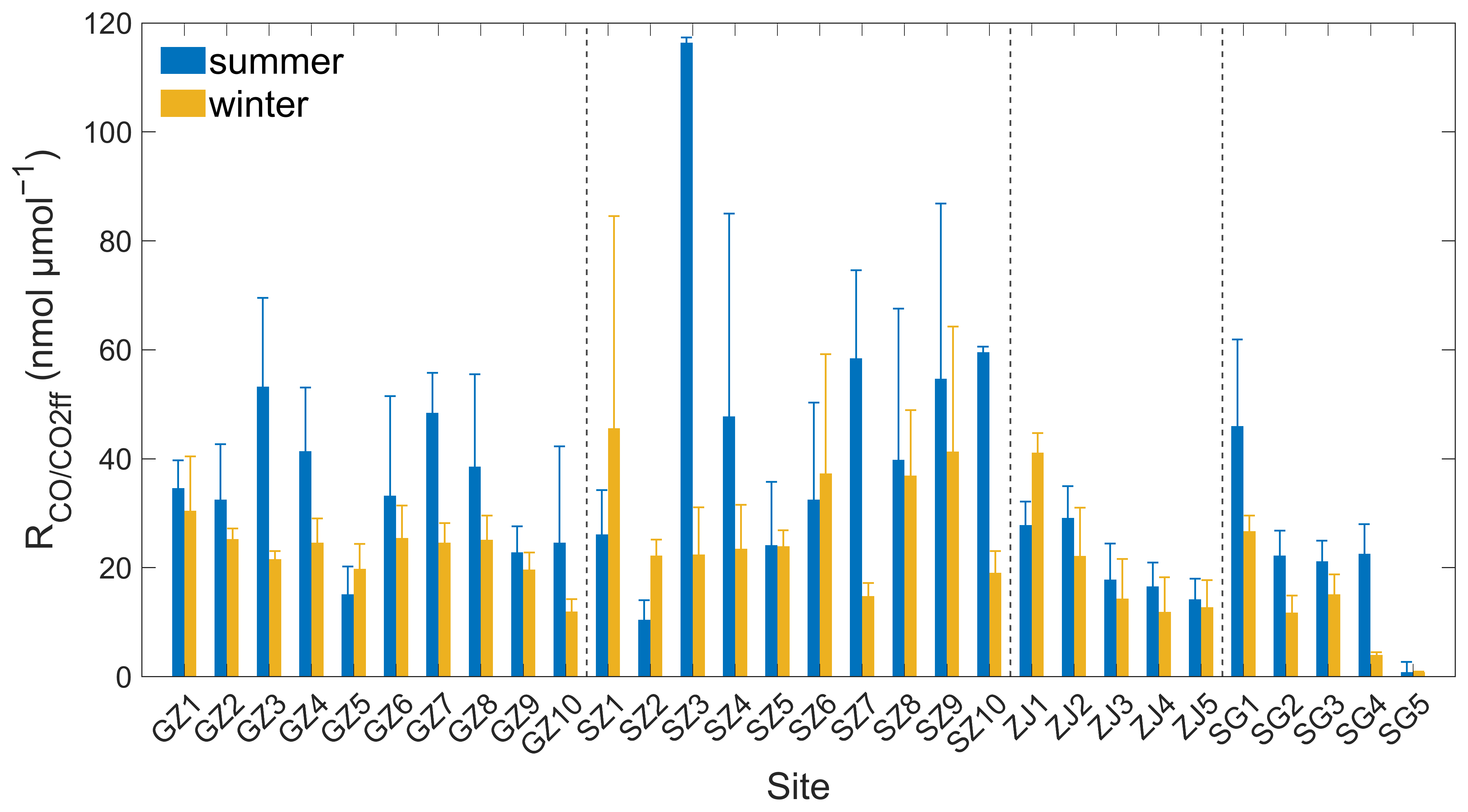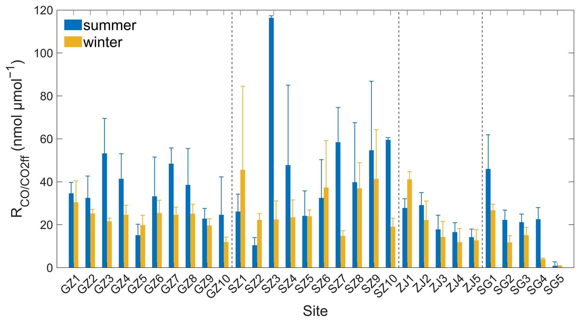 We calculated RCO/CO2ff ratios at each measurement site and found higher ratios in summer than winter (Fig. J1). However, we focused only on observations in winter for four reasons. First, summer CO shows greater instability as its atmospheric lifetime depends on OH radical production, which is enhanced through photochemical reactions (e.g., CH4 oxidation) under intense solar radiation, making CO a less reliable fossil fuel tracer (Rosendahl, 2022). Second, winter exhibits stronger ΔCO-Cff correlations (r>0.6, p<0.01; Fig. J2) with better regional representativeness due to extended CO atmospheric lifetime from slower CO oxidation rates. Third, the winter ΔCO-Cff relationship better captures anthropogenic emission characteristics compared to other seasons. Fourth, weaker vertical mixing in winter accentuates local emission impacts (Wang et al., 2010). In addition, the lower Cff signals observed in summer lead to higher uncertainty in the regression slope and thus greater uncertainty in the RCO/CO2ff ratios, as also noted in Maier et al. (2024), which can be seen in the larger error bars of the summer data in Fig. J2.