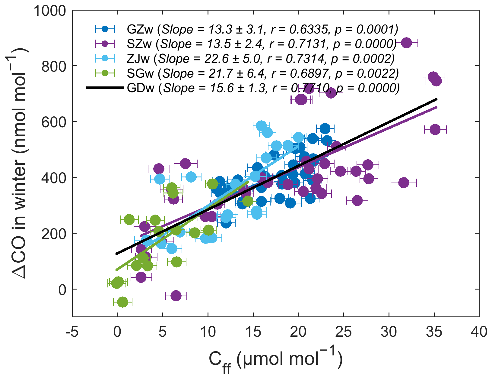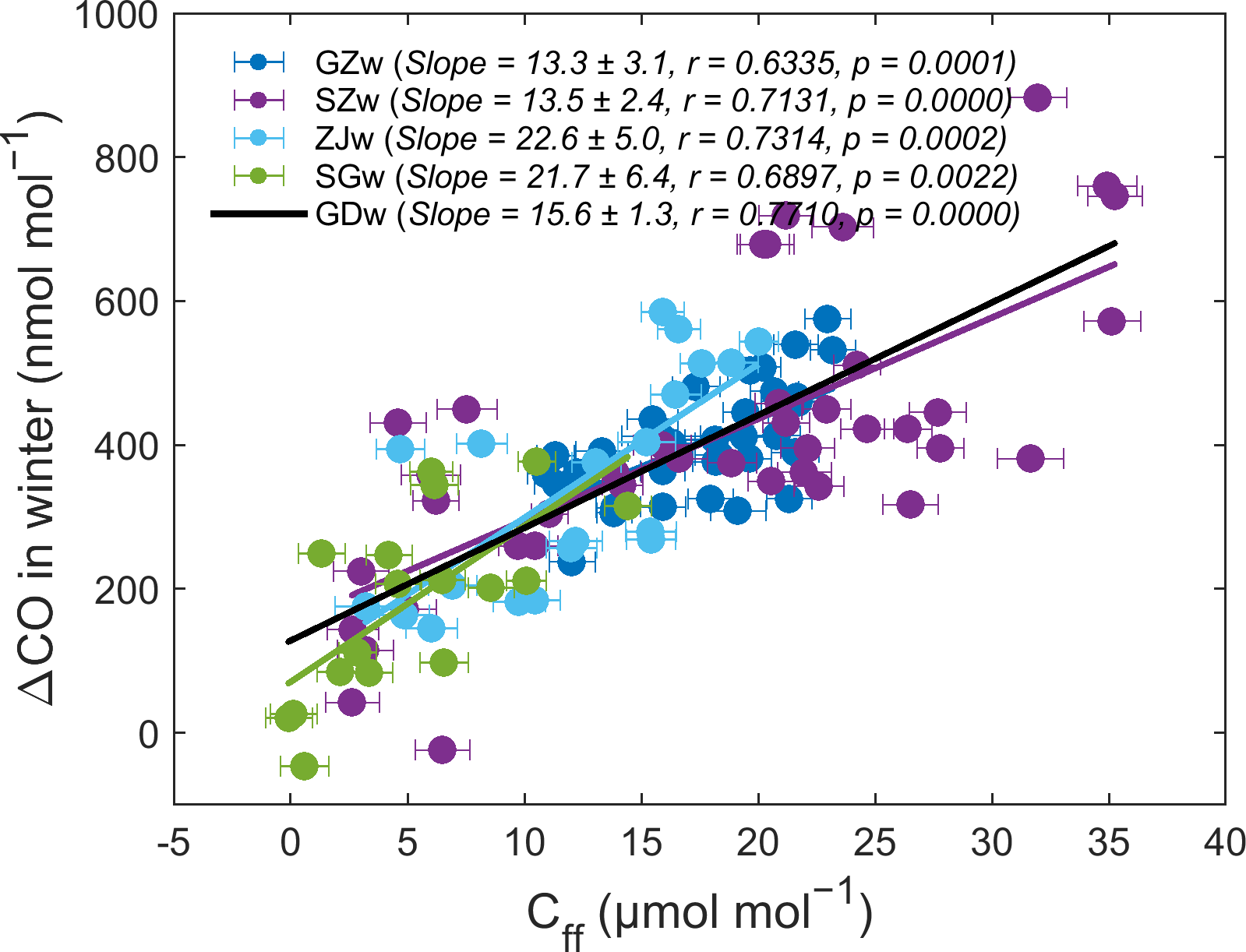 We calculated Pearson correlation coefficient (r) between Cff and CO enhancement (ΔCO=COobs-CObg), and observational concentration ratio of Δ CO to Cff (RCO/CO2ff) (ppb ppm−1 (nmol µmol−1; similar hereafter)) using linear least squares regression. The RCO/CO2ff ratios were derived from the regression slopes of ΔCO versus Cff concentrations. Here, CO and CO2ff enhancements are defined relative to a regional background site, which is intended to represent upwind regional conditions rather than a completely remote, pristine background. Consequently, the inferred ΔCO and Cff, and thus the derived RCO/CO2ff ratios, may include contributions from emissions outside the target city. We do not explicitly correct for this potential bias, but we consider it as an additional source of uncertainty when comparing observational RCO/CO2ff with city-level ICO/CO2ff ratios from emission inventories.
