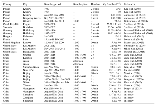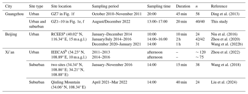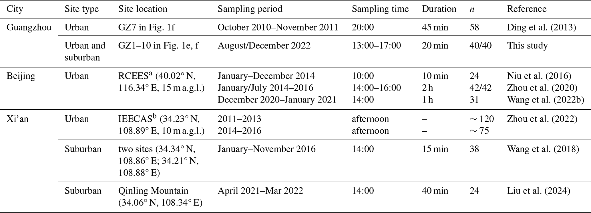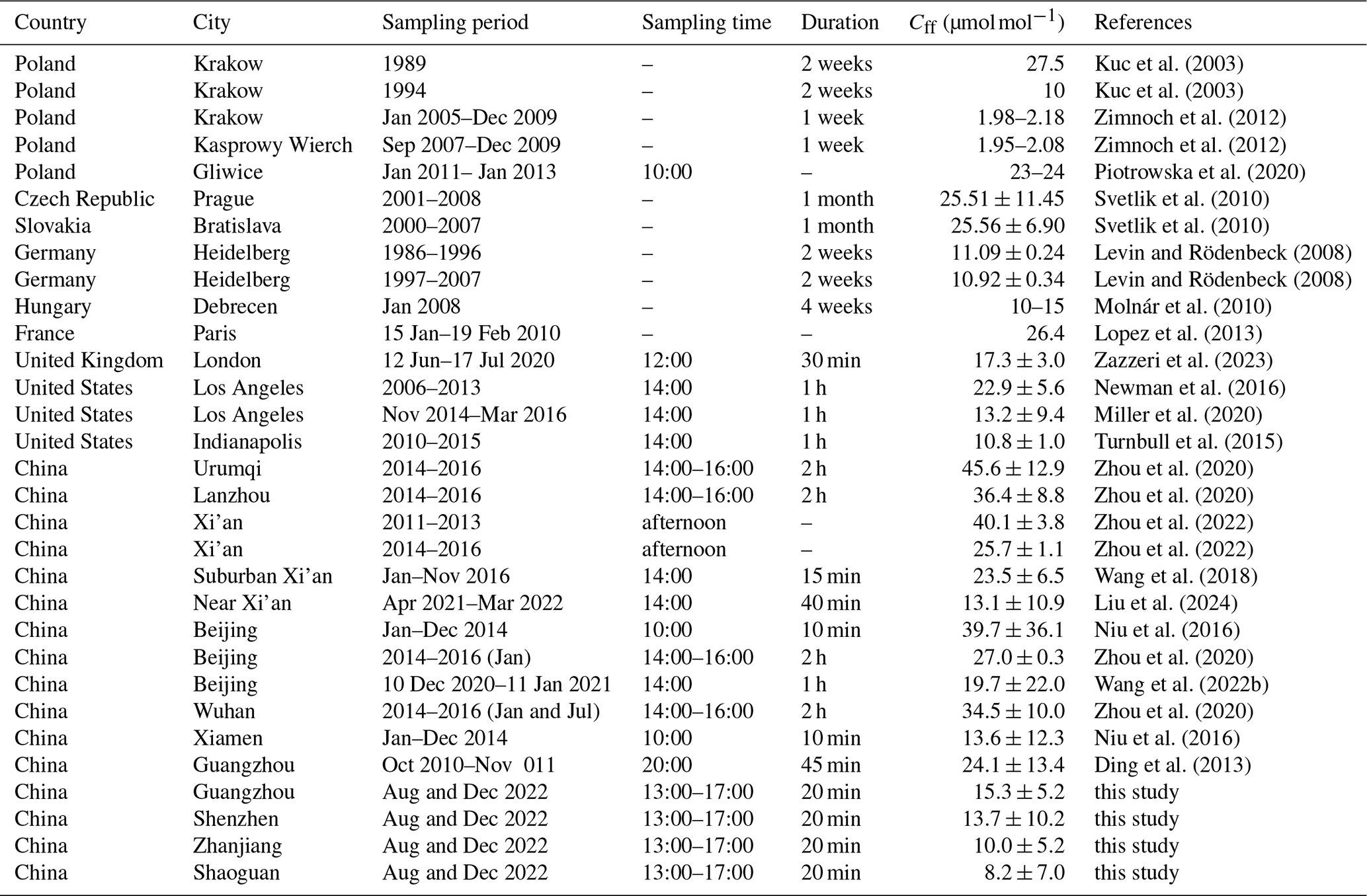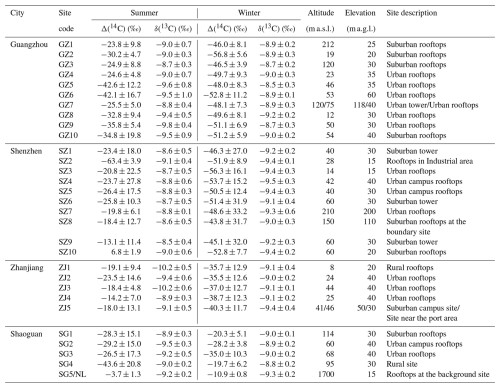 The locations and details of these sampling sites are shown in Fig. 1 and summarized in Table A1. Ten sampling sites were located in Guangzhou (GZ1–GZ10), ranging from urban downtown to suburban areas, selected based on spatial gradients of Cff emissions derived from the Open-source Data Inventory for Anthropogenic CO2 (ODIAC) (Oda and Maksyutov, 2011; Oda and Maksyutov, 2024). Another 10 sampling sites were distributed uniformly throughout Shenzhen (SZ1–SZ10). In Zhanjiang (ZJ1–ZJ5) and Shaoguan (SG1–SG5), five sampling sites were selected in each city, primarily in urban areas, and distributed according to the first and second most dominant wind directions. These sites are located on the tower or on the roof of the building with 10–12 m extendable masts and are chosen to be free from any modifying effects of surrounding skyscrapers. Most of our sampling sites are generally no more than 300 m from the nearest air quality monitoring station. The sampling height is usually kept above 30 m above the ground level to avoid the influence of local sources. We assume that the measurements at the sampling sites in Guangzhou and Shenzhen are statistically sufficient to assess the whole cities, while those in Zhanjiang and Shaoguan are sufficient to assess the urban areas. Air sampling occurred between 13:00 and 17:00 LT (local time), coinciding with the deepest planetary boundary layer and well-mixed atmospheric conditions. Post-filtration samples were transferred into pre-evacuated/flushed 3 L borosilicate flasks using 12 V micro-diaphragm pumps. These delivered a flow rate of 6 L min−1 at 25 °C and 101.3 kPa, with pressurization to 172.4–206.8 kPa. The duration of the sampling was approximately 15–20 min in total.