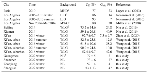 For Guangzhou, a site-specific long-term comparison was conducted at the GZ7 urban station, which was also used by Ding et al. (2013). In their study, Cff was derived from flask observations collected around 20:00 LT (post-rush-hour) using a Δ(14C) background based on corn-leaf samples from Qinghai, Gansu, and Tibet. Such a background likely represents a different air-mass domain from Guangzhou. In contrast, the present study used atmospheric Δ(14C) observations from the NL regional background site, which directly samples the same regional air masses influencing Guangzhou. To harmonize the background reference used in the Cff calculation between studies, the winter 2010 Cff values from Ding et al. (2013) and the winter 2022 values from this work were recalculated using the NL tree-ring Δ(14C) record (Li et al., 2025b) as a common reference baseline. The NL tree-ring Δ(14C) represents a growing-season (March–October) integrated proxy and the 2022 value is linearly extrapolated from the 2011–2020 record; it is therefore not intended to represent wintertime background variability and is used here only to provide an internally consistent baseline for inter-study comparison. This adjustment changes Cff from 45.6±5.3 to 44.2±5.3µmolmol-1 for 2010, and from 16.8±3.4 to 12.5±3.4µmolmol-1 for 2022.