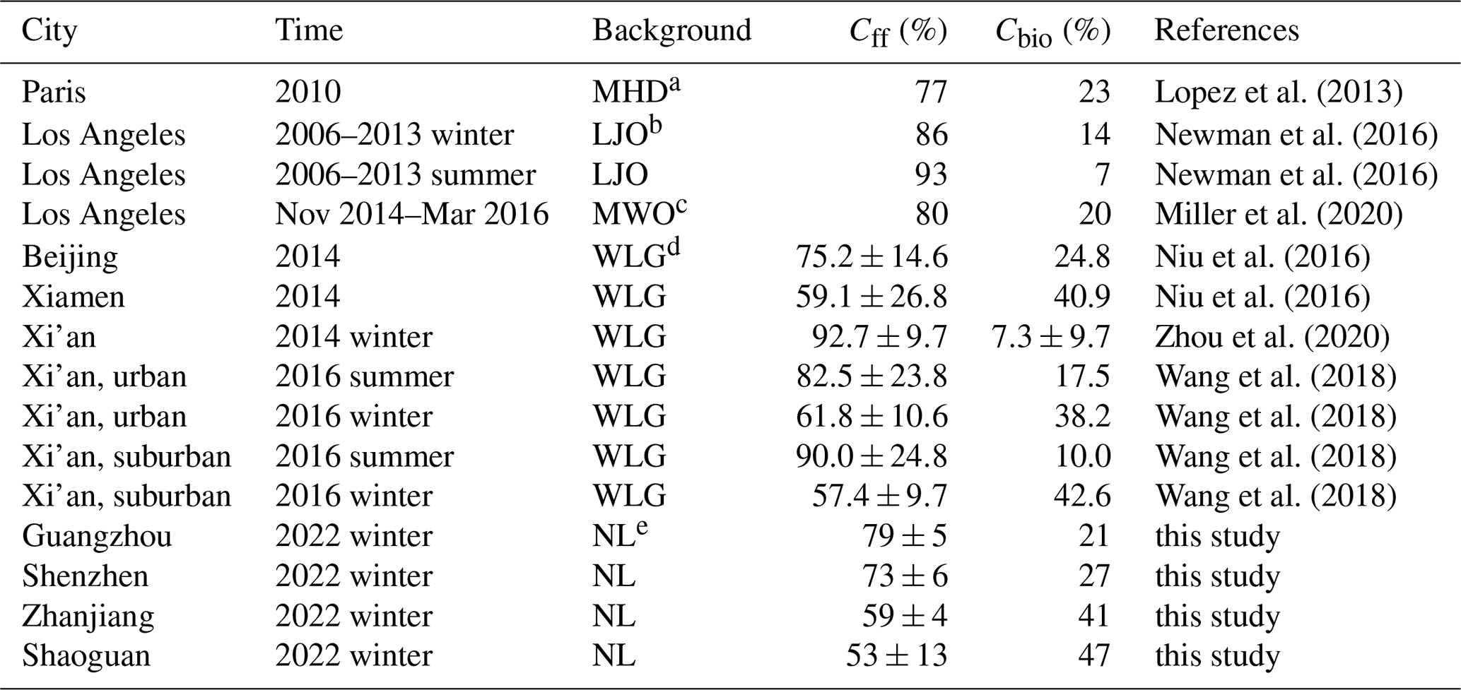 CO2 concentrations in Guangzhou, Shenzhen, Zhanjiang, and Shaoguan were (438.8±12.3), (435.0±12.7), (444.2±17.2), and (431.6±10.5)µmolmol-1 (multisite mean and one-sigma standard deviation), respectively; the corresponding Δ(14C) values were (-40.7±13.4), (-37.2±24.1), (-28.8±13.8), and (-25.0±14.9), respectively. Relative to the background, CO2 concentrations in the four cities were enhanced by (20.3±12.5), (16.5±13.5), (25.8±16.7), and (13.1±10.1)µmolmol-1 (Cxs), respectively; the mean Δ(14C) was depleted by (-33.6±11.3), (-29.9±22.3), (-21.5±11.7), and (-17.8±15.7) (ΔΔ(14C)), respectively, reflecting the marked influence of 14C-free CO2 emissions from fossil fuel combustion. The fossil fuel and biogenic fractions of Cxs, Cff and Cbio, were determined using a two end-member mixing analysis. The Cff fractions were (79±5) %, (73±6) %, (59±4) %, and (53±13) % during winter in Guangzhou, Shenzhen, Zhanjiang, and Shaoguan, respectively. In comparison with other cities worldwide (Table E1 and Fig. E1), we observed higher Cff fractions (>70 %) in some megacities and supercities compared with large and medium-sized cities. Noting that the Cff/Cxs ratio is critically sensitive to background selection. Regional backgrounds (as implemented here) introduce Cbio contributions from surrounding rural/agricultural sources to Cxs, whereas local urban backgrounds effectively isolate urban emissions by filtering out these external biogenic signals, thereby increasing the apparent Cff fraction compared to regional background approaches. The consistent adoption of regional background methodologies across all studies in Table E1 ensures the comparative validity of the results, as they share a common framework for accounting for Cbio influences from peripheral non-urban sources. The derived annual Cff averages are (15.3±5.2), (13.7±10.2), (10.0±5.2), and (8.2±7.0)µmolmol-1 in Guangzhou, Shenzhen, Zhanjiang, and Shaoguan, respectively, based on the mass balance equations of CO2 and Δ(14C). These Cff concentrations were low to moderate compared with those in other cities globally (Table E2 and Fig. E1), despite the high emissions in Guangzhou and Shenzhen from inventories (Fig. 1).
