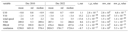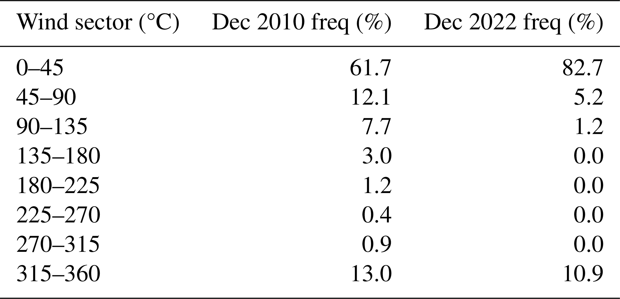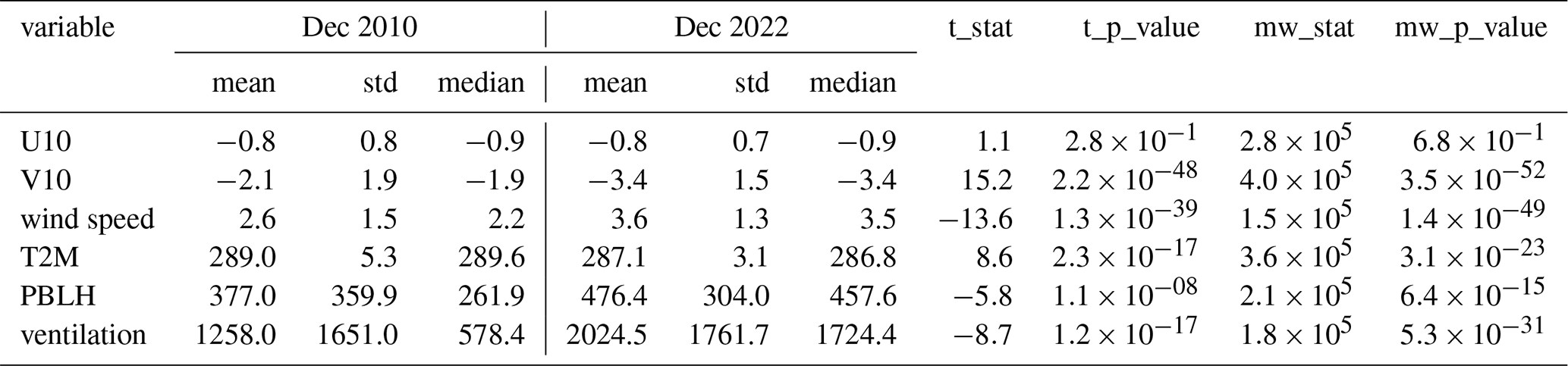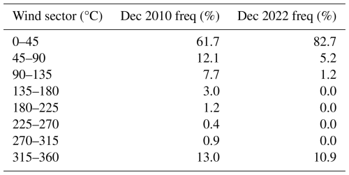 To directly compare the meteorological environments of the two sampling years, we further analysed ERA5 diagnostics on flask sampling days at GZ7 (Tables G1 and G2). Both December 2010 and December 2022 were dominated by northerly to north-easterly flow, with winds in the 0–45° sector accounting for 61.7 % and 82.7 % of occurrences, respectively (Table G2). However, December 2022 exhibited stronger winds and deeper boundary layers than December 2010 (mean wind speed: 3.6 vs. 2.6 m s−1; mean PBLH: 476 vs. 377 m; mean ventilation: 2024.5 vs. 1258.0 m2 s−1), and these differences are statistically significant (p<0.01 for both Student's t-test and Mann–Whitney U test; Table G1). These conditions would tend to dilute near-surface enhancements in 2022 relative to 2010, implying that the observed decreases in Cff and RCO/CO2ff between the two periods are, if anything, conservative with respect to emission changes.
