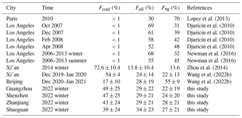 We adopted the end-member δ(13C) signatures measured in Beijing: δcoal=(-24.3±0.2), δoil=(-28.9±0.5) and δng=(-33.2±0.9) (Wang et al., 2022a). This selection was based on three considerations: First, coal δ(13C) signatures exhibit remarkable regional stability in China (Wang et al., 2022a). Second, oil signatures from the Pearl River Mouth Basin of (-28.1±1.6) (Cheng et al., 2013) show close agreement with Beijing values of (-28.9±0.5). Third, measured natural gas signatures like (-33.2±0.9) in Beijing and (-32.0±0.1) in Xi'an are significantly enriched compared to literature averages (−39.5 ‰ in Beijing and (-38.9±2.6) in Pearl River Mouth Basin) (Ping et al., 2018; Quan et al., 2018), as using the lower literature values would lead to underestimation of natural gas contributions.
