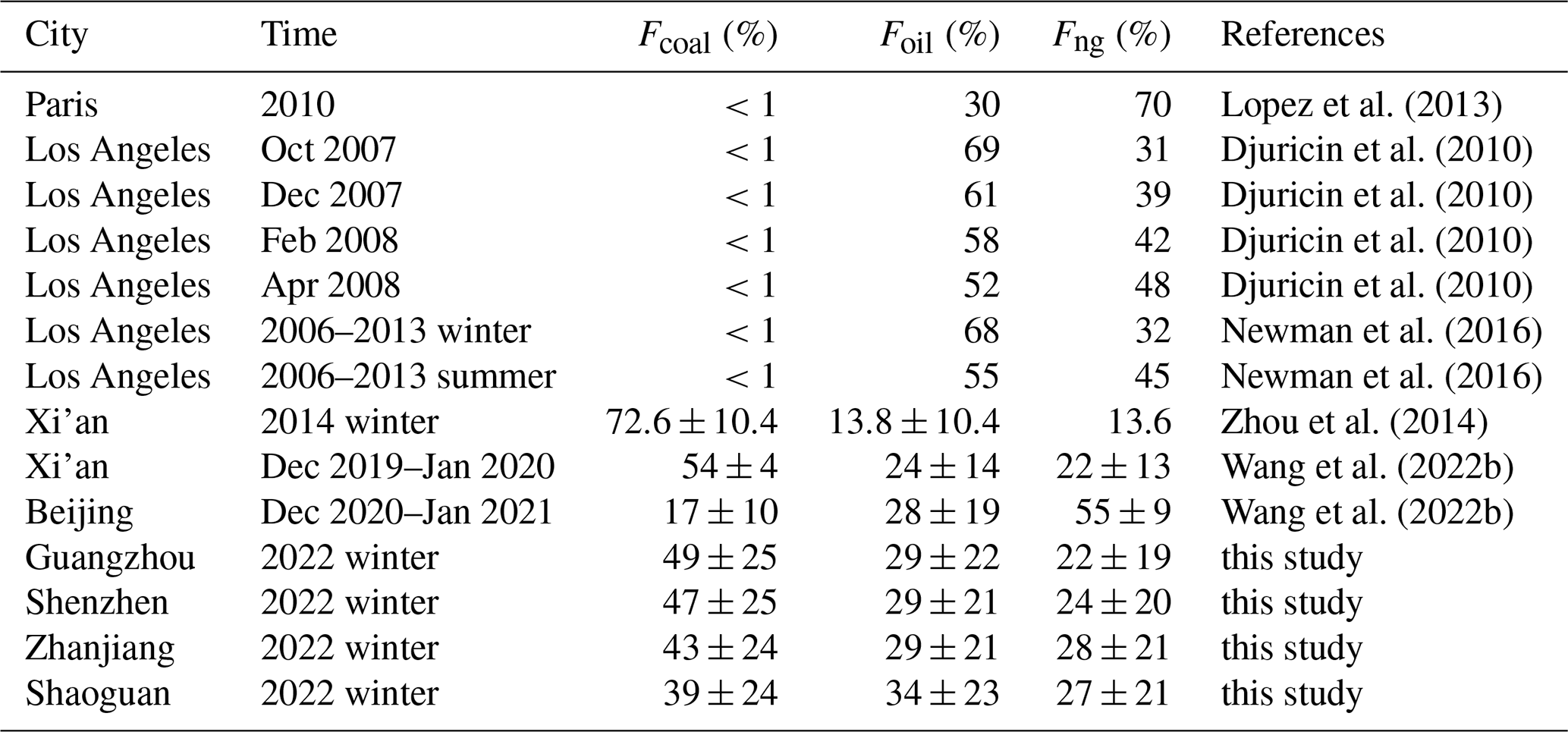 We determined the coal, oil, and natural gas fractions of Cff using the Keeling plot of δ(13C) and CO2 (i.e., scatter plot between δ(13C) and inverse of CO2 mole fractions) and the Bayesian mixing model (MixSIAR) (Stock et al., 2018) during winter 2022. The fractions in winter were (49±25) %, (29±22) %, and (22±19) %, respectively, for Guangzhou, (47±25) %, (29±21) %, and (24±20) % for Shenzhen, (43±24) %, (29±21) %, and (28±21) % for Zhanjiang, and (39±24) %, (34±23) %, and (27±21) % for Shaoguan (Table I1). Coal combustion was the largest contributor to Cff emissions, followed in descending order by oil combustion and natural gas combustion. Compared with other cities around the world (Table I1), we found natural gas was the primary fuel type consumed in Paris (70 %) (Lopez et al., 2013) and Beijing (55±9 %) (Wang et al., 2022b), whereas oil was the main fuel type consumed in Los Angeles (>50 %) (Djuricin et al., 2010; Newman et al., 2016). Coal remains the primary fossil fuel used in Xi'an ((72.6±10.4) % in 2014 and (54±4) % in 2019) (Wang et al., 2022b; Zhou et al., 2014), Guangzhou (49 % in 2022), and Shenzhen (47 % in 2022). Notably, cities with high Cff emissions consume all three types of fossil fuels, with the dominant fuel type varying by city. Coal remains the primary fossil fuel used in many Chinese cities.