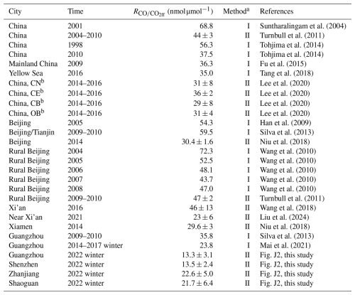 We systematically compared observational RCO/CO2ff values with inventory ICO/CO2ff estimates. Our 2022 measurements of the RCO/CO2ff ratios in megacities (Guangzhou and Shenzhen) were consistent with EDGAR estimates (14.9 nmol µmol−1, 2022), while those in smaller cities (Zhanjiang and Shaoguan) were closer to MEIC values (19.2 nmol µmol−1, 2020) (Fig. 6a) and independent field measurements near Xi'an (23±6nmol µmol−1, 2021) (Liu et al., 2024). City comparisons of observations against MEIC estimates revealed systematic deviations: Shenzhen's observed ratio fell 42 % below inventory estimates (23.4 nmol µmol−1), whereas Shaoguan's exceeded projections (12.7 nmol µmol−1) by 71 %; Guangzhou's and Zhanjiang's are similar to inventory estimates (14.2 and 23.8 nmol µmol−1, respectively) (Fig. 6b). When a regional background site is used, however, the inferred RCO/CO2ff ratios may be influenced by emissions from outside the target city, so that the observed ratios represent a mixture of urban and regional emission signatures rather than a purely city-scale signal. This background effect may therefore contribute to some of the discrepancies between RCO/CO2ff and ICO/CO2ff.