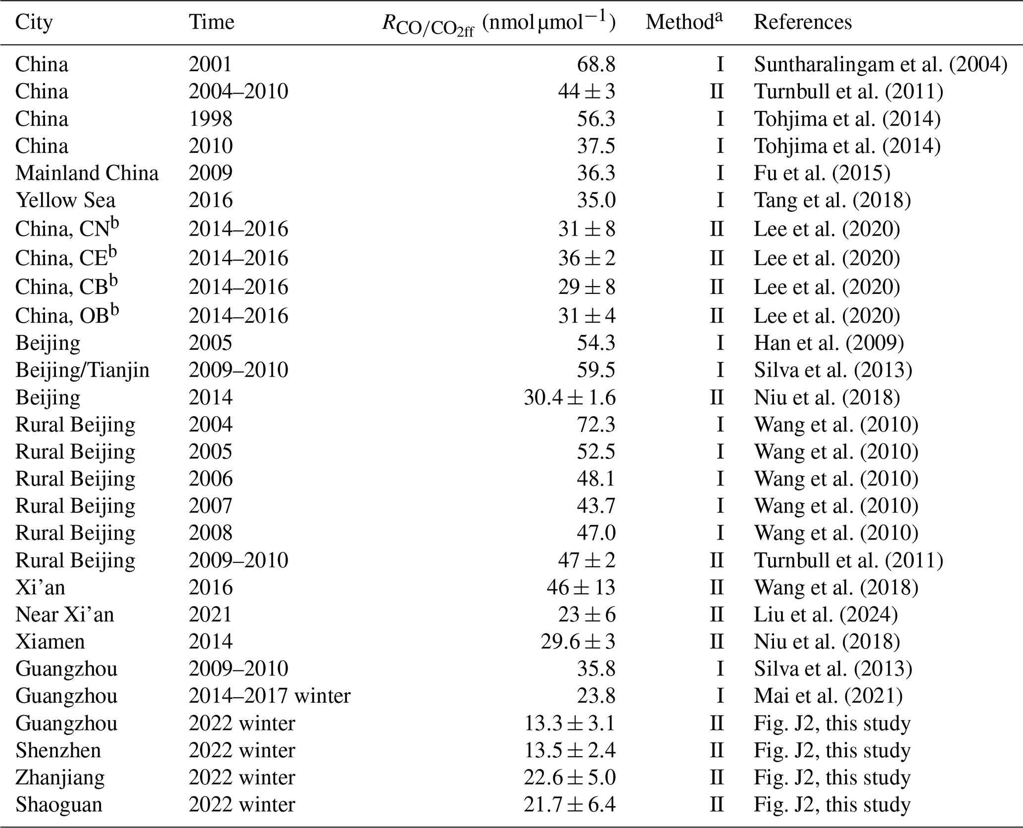 For comparison, the inventory emission ratio of CO to Cff (ICO/CO2ff) (ppbppm-1(nmolµmol-1)) was calculated following Lee et al. (2020) as: