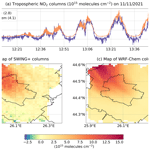Figure 7Tropospheric NO2 columns on Thursday 11 November 2021, presented as a temporal series of SWING+ and WRF-Chem values plotted against local time, with mean values in parentheses in (a), and corresponding maps in (b) and (c).
