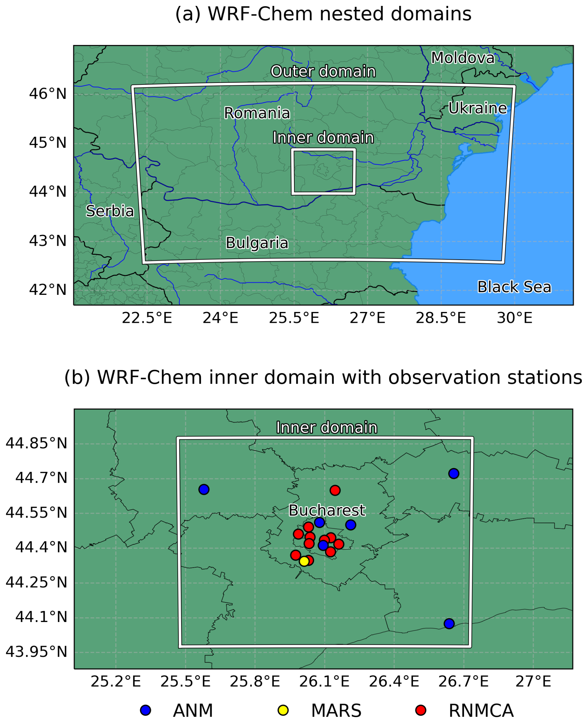 We employ the Weather Research and Forecasting model coupled with Chemistry (WRF-Chem) version 4.5.1, along with the WRF Pre-processing System (WPS) version 4.5 (Grell et al., 2005; Skamarock et al., 2019). Our simulations use two nested domains centered on Bucharest, Romania. The outer domain covers 400 × 600 km2 at a 5 × 5 km2 resolution, extending across Romania and Bulgaria, and also covering parts of the Black Sea, Serbia, Moldova, and Ukraine. The inner domain spans 100 × 100 km2 at a 1 × 1 km2 resolution, with its southern and eastern borders intersecting the border between Romania and Bulgaria (Fig. 1). The vertical grid of the model comprises 44 levels, reaching altitudes up to ca. 20 km.