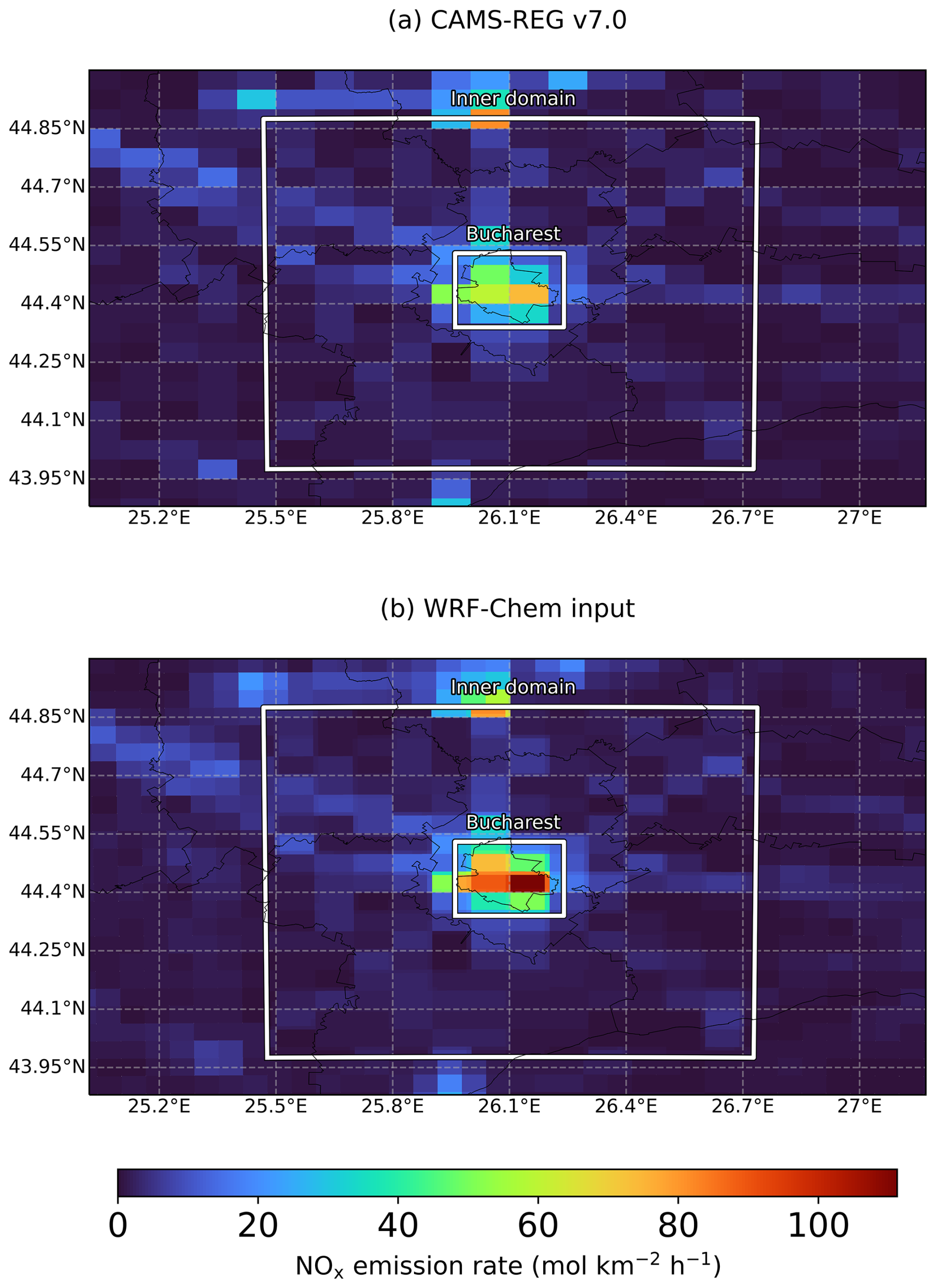 Figure 2Distribution of NOx emission rates over the WRF-Chem inner domain, summed across all GNFR sectors and averaged for 2021 and 2022. (a) From the CAMS-REG v7.0 inventory at its native resolution. (b) From the CAMS-REG v7.0 inventory, with the emission factor increased by a factor of 1.5 over the Bucharest box, mapped to the WRF-Chem resolution.