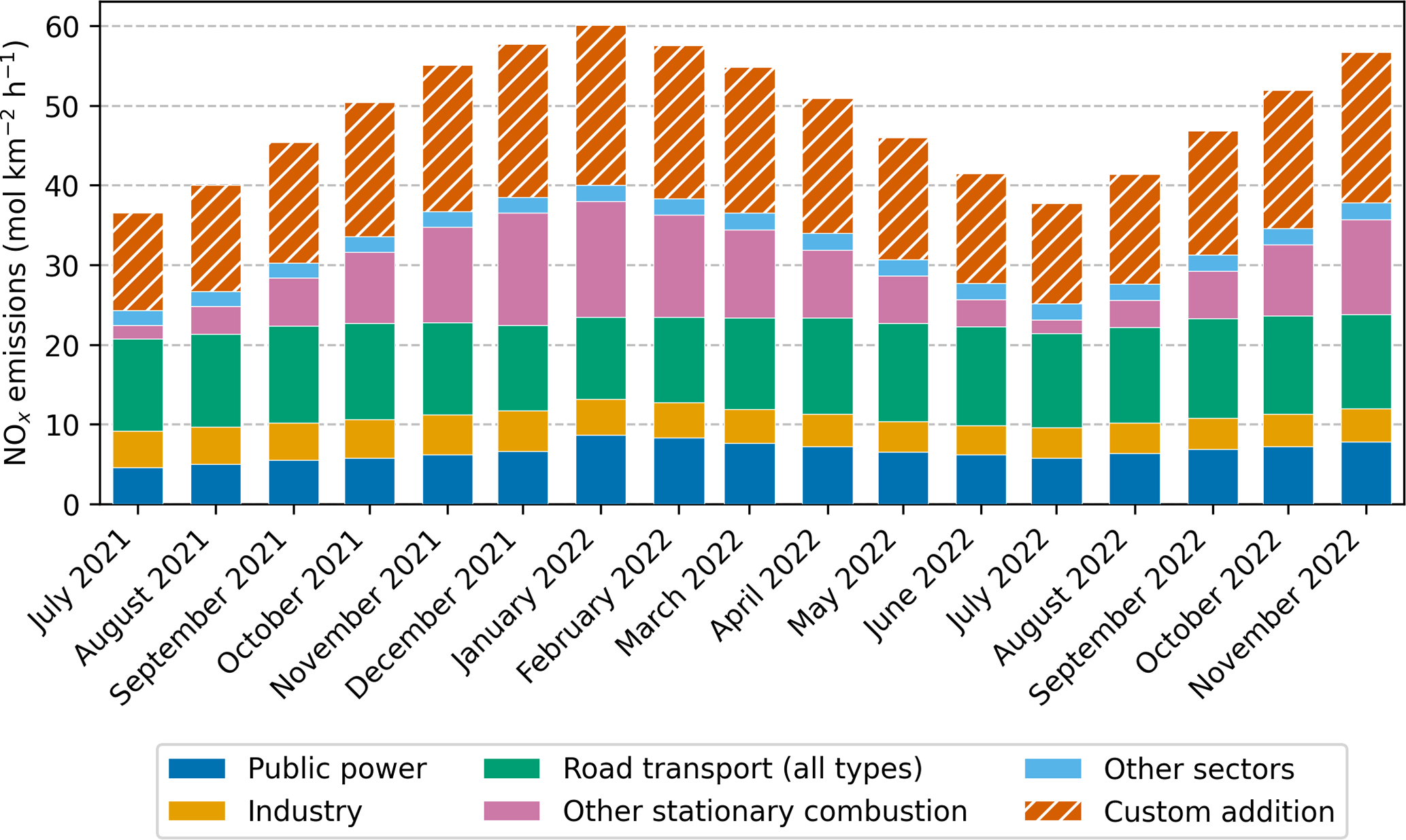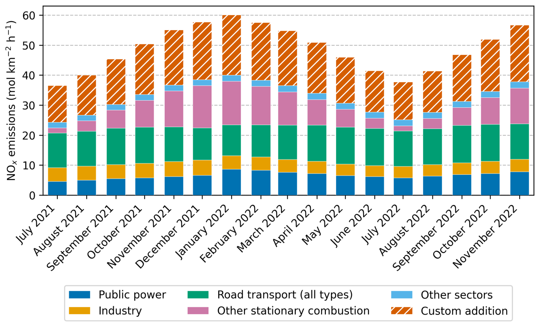 Figure 3Seasonal distribution of anthropogenic NOx emissions from CAMS-REG v7.0 over the Bucharest box by sector for the simulation period in 2021–2022, including the custom addition (+50 %, hatched) resulting from the upscaling of total CAMS-REG emissions.