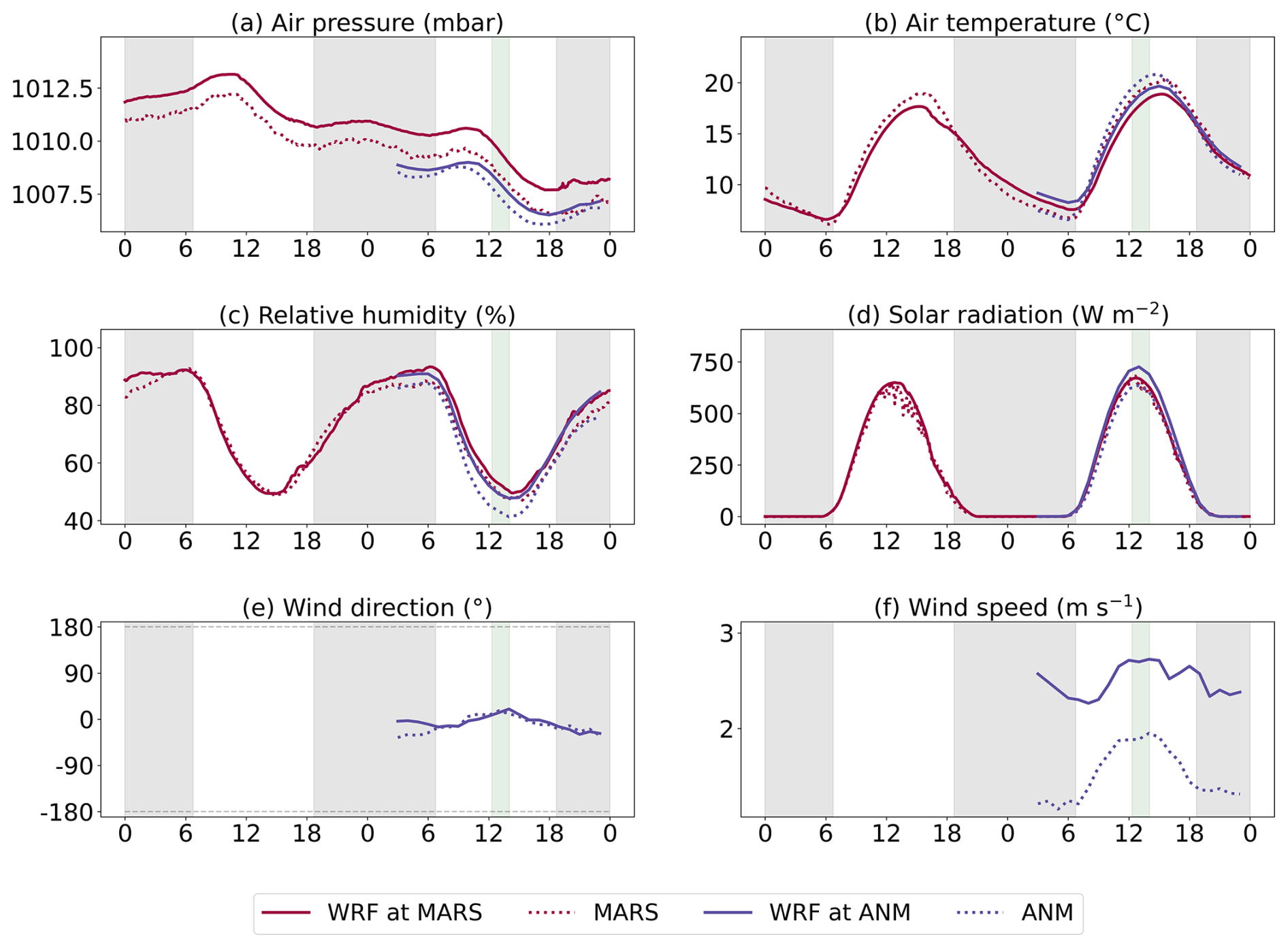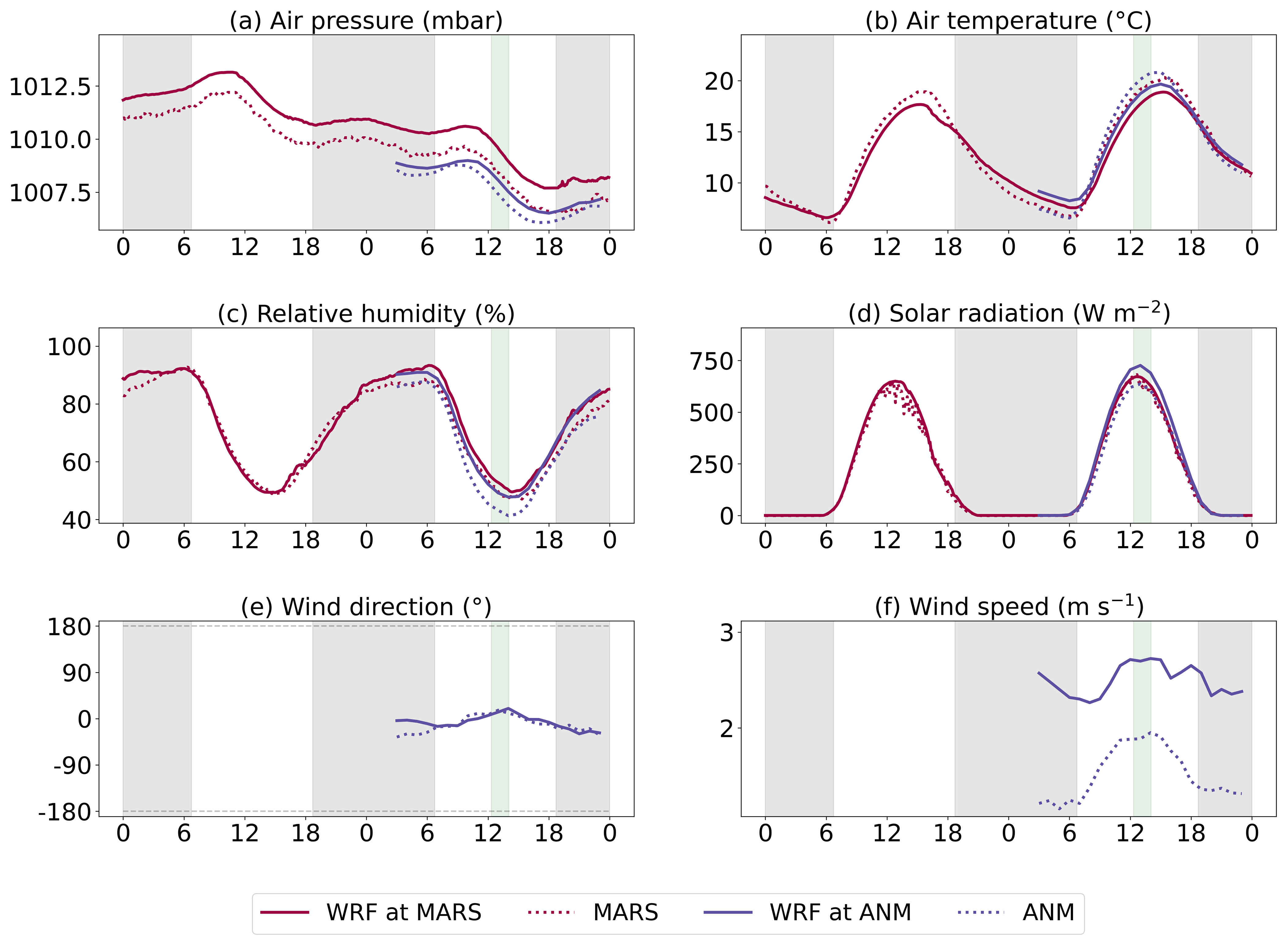 Figure 4Surface meteorological measurements from MARS and ANM and comparison with WRF-Chem. The horizontal axes represent local time in hours. Each plot focuses on a specific meteorological parameter and includes all 17 one or two-day time series from the various stations, when available, averaged into a single time series. Some points were excluded from the plots when the number of available station-date pairs fell below 95 % of the maximum, as this was considered unrepresentative visually, though the data is still included in the main text analysis. Gray and green windows indicate the averaged nighttime and SWING+ flight hours from the measurement dates, respectively.
