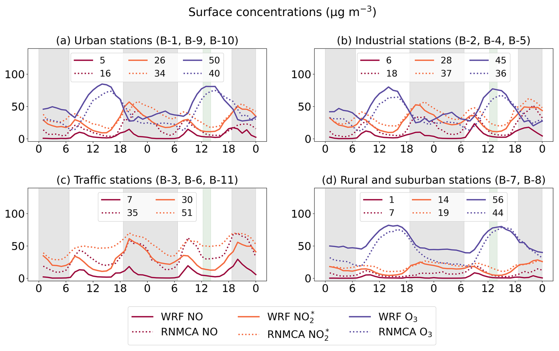 We compare surface concentration measurements from the RNMCA network with WRF-Chem for NO, , and O3 at the model lowest vertical level. Figure 5 displays the model performance for the different types of stations. Each plot includes measurements from the 17 two-day time series, averaged into a single time series. Therefore, the discussion of seasonality is deferred to a later part of this section.