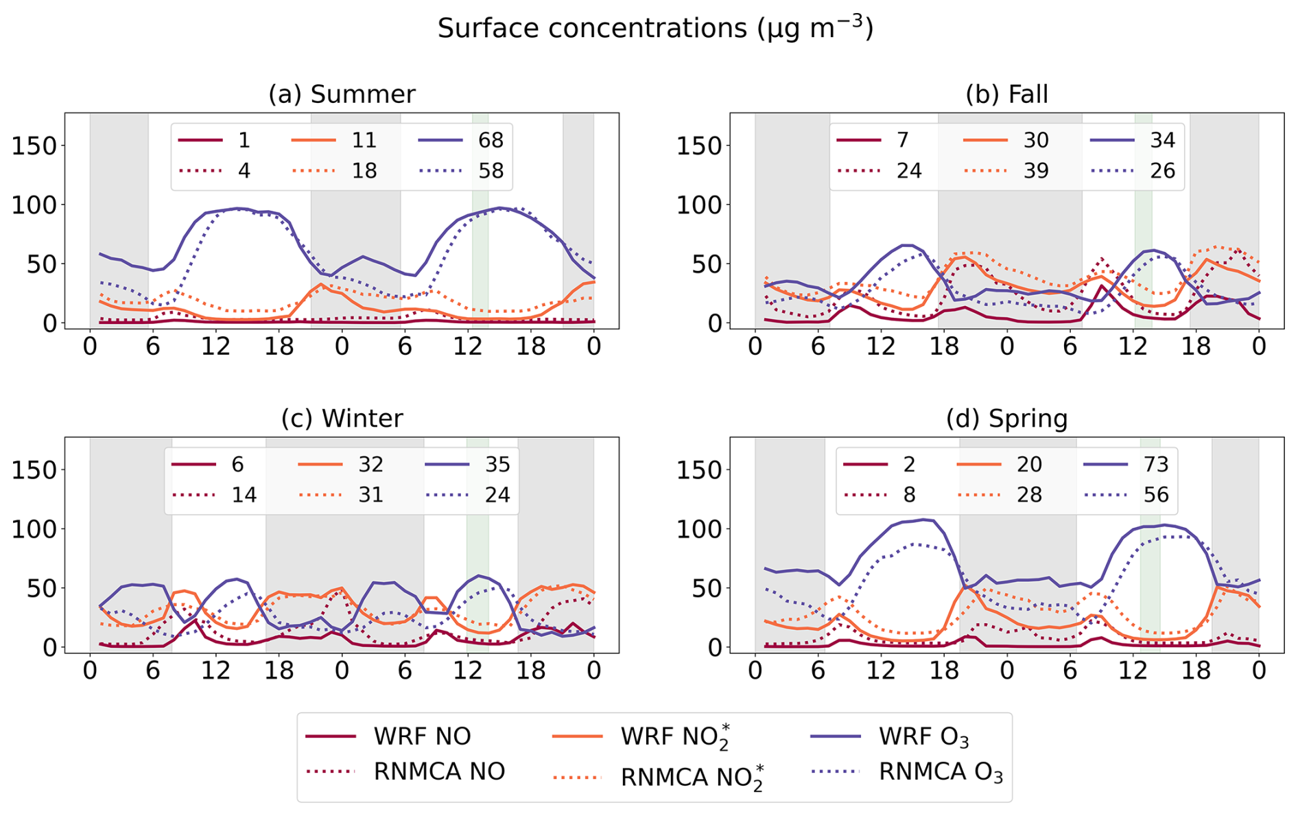 Similarly to NO, surface levels of are generally underestimated. The best agreement is found in winter, where nighttime values appear to be particularly well reproduced. The diurnal evolution during this season is also well captured, though with greater variation. The morning rush hour peak is visible in the modeled values for fall and spring but is too flat during summer. Daytime correlation coefficients range from 0.59 in summer to 0.73 in winter.