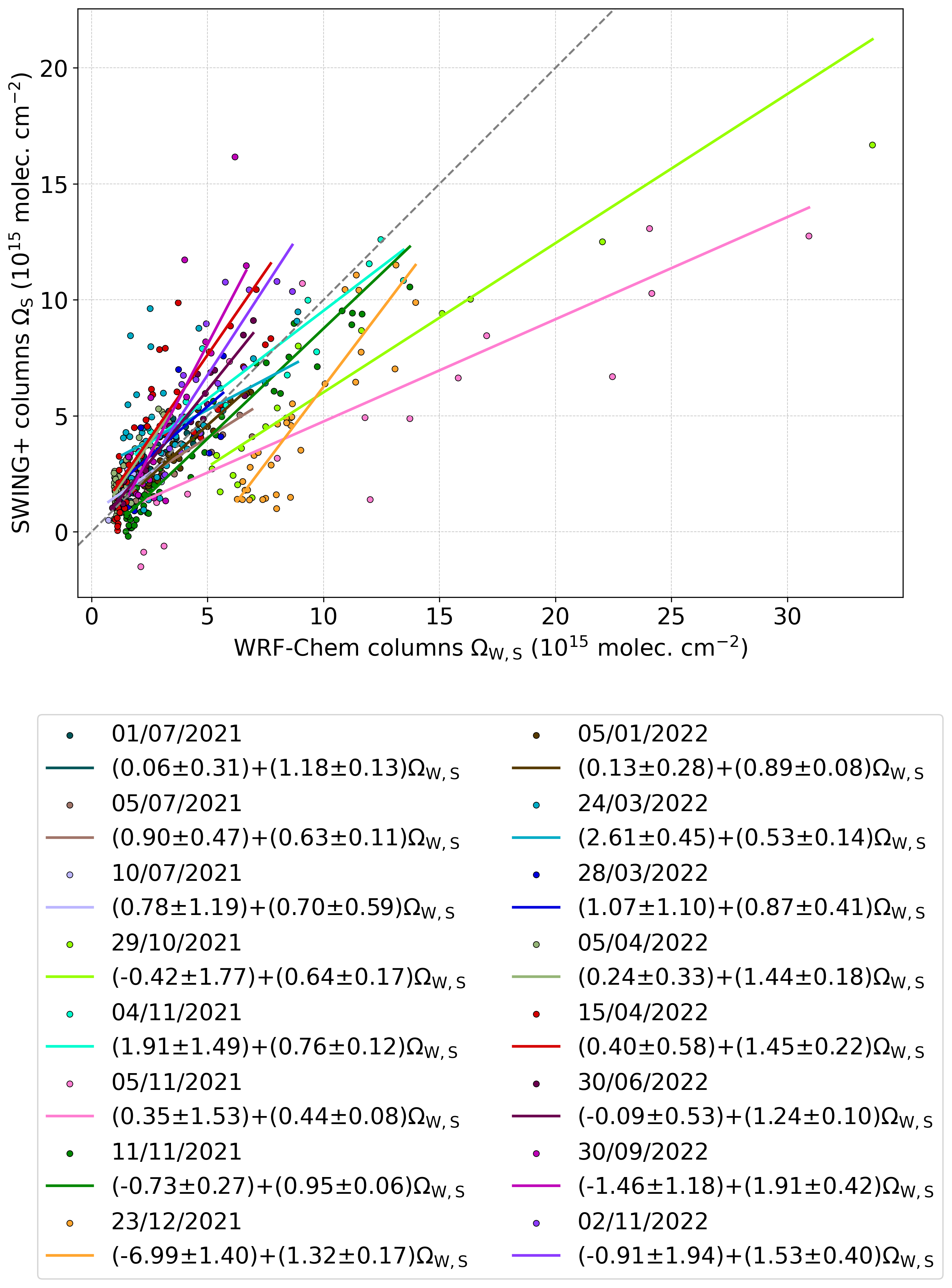 In both steps, we assume that the biases of the model and the satellite can be captured through linear regression against reference values. Both parametric and robust linear regression methods (Theil–Sen estimator; Theil, 1950; Sen, 1968) are tested, with the latter suppressing the impact of outliers. Importantly, the resulting linear corrections not only adjust mean column magnitudes but also modify spatial gradients to first order, as the bias is estimated as a concentration-dependent quantity. To ensure the quality of the results, a selection of flight days will be made based on the evaluation of the model against SWING+ data. Note that this method generalizes the approach of Poraicu et al. (2023) by extending it to simultaneously address multiple flight days. In their study, WRF-Chem biases relative to the airborne instrument APEX and to TROPOMI were subtracted to infer the bias of TROPOMI with respect to APEX, one flight date at a time.