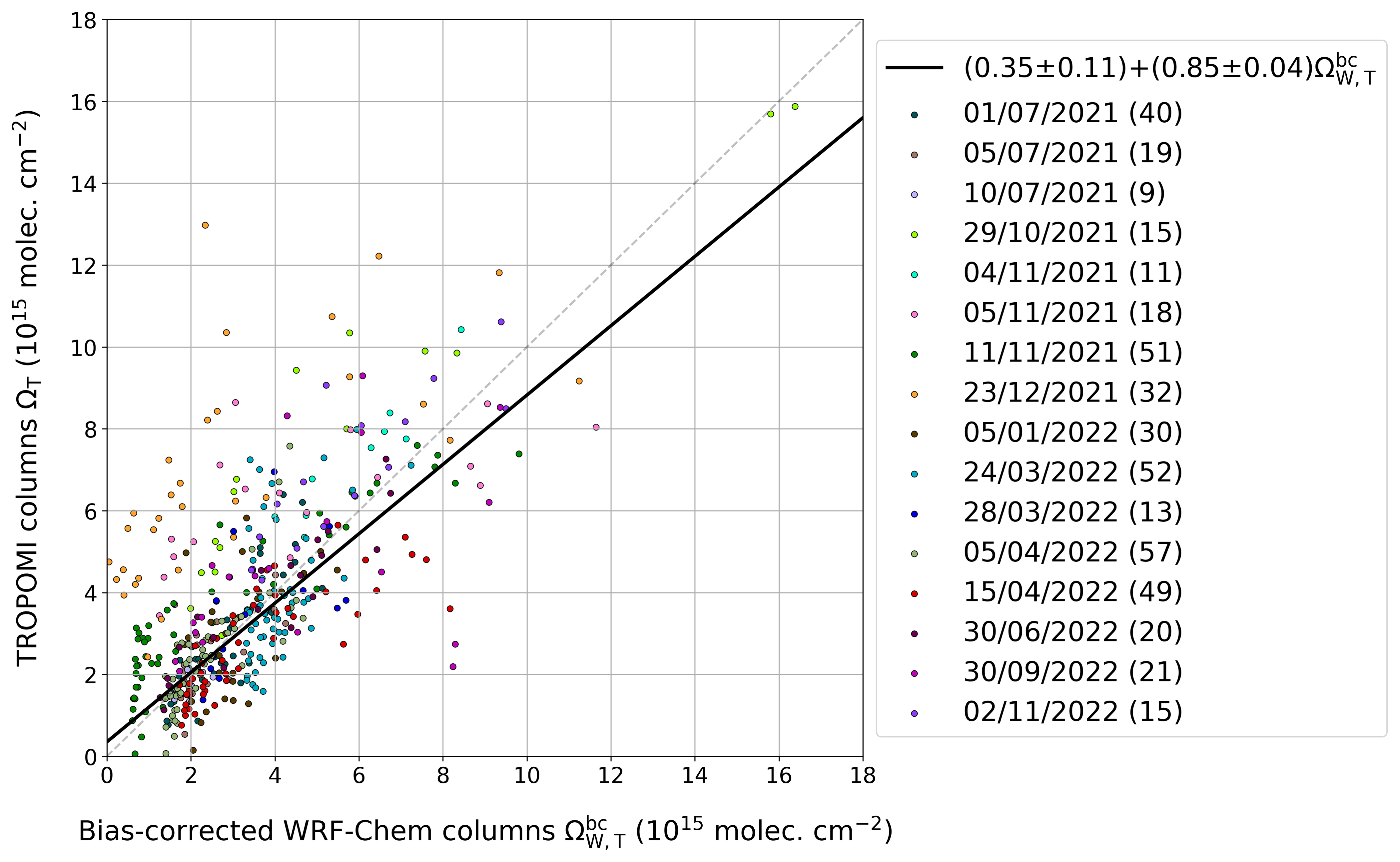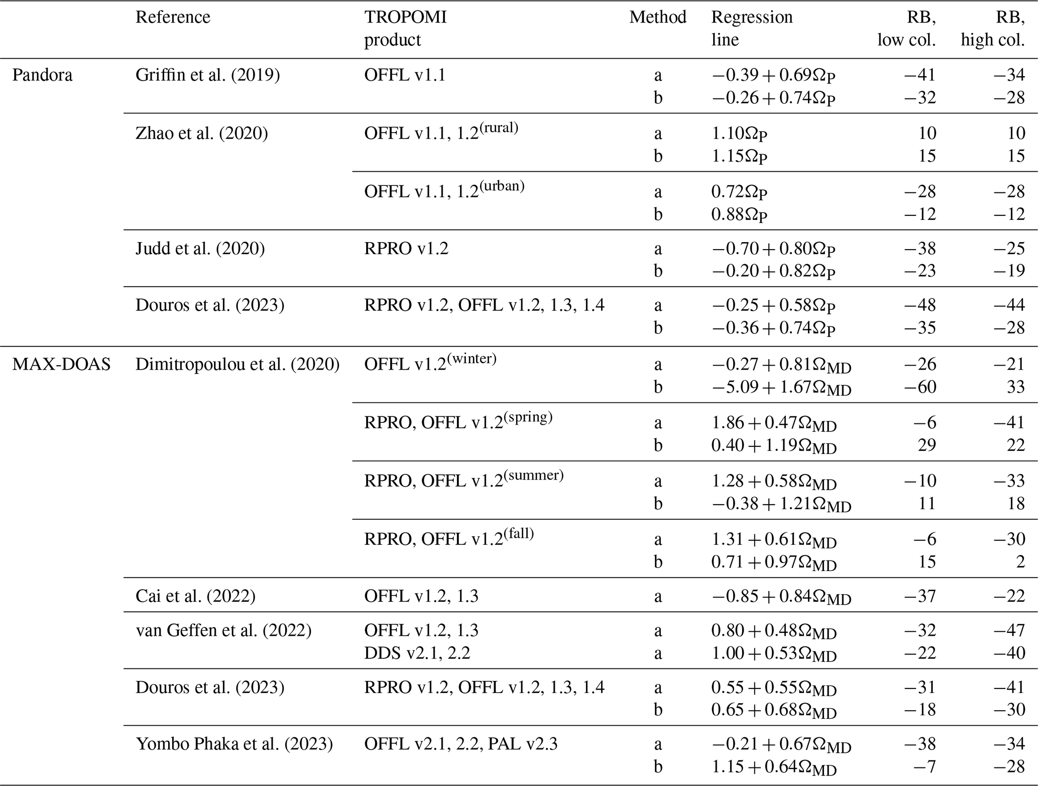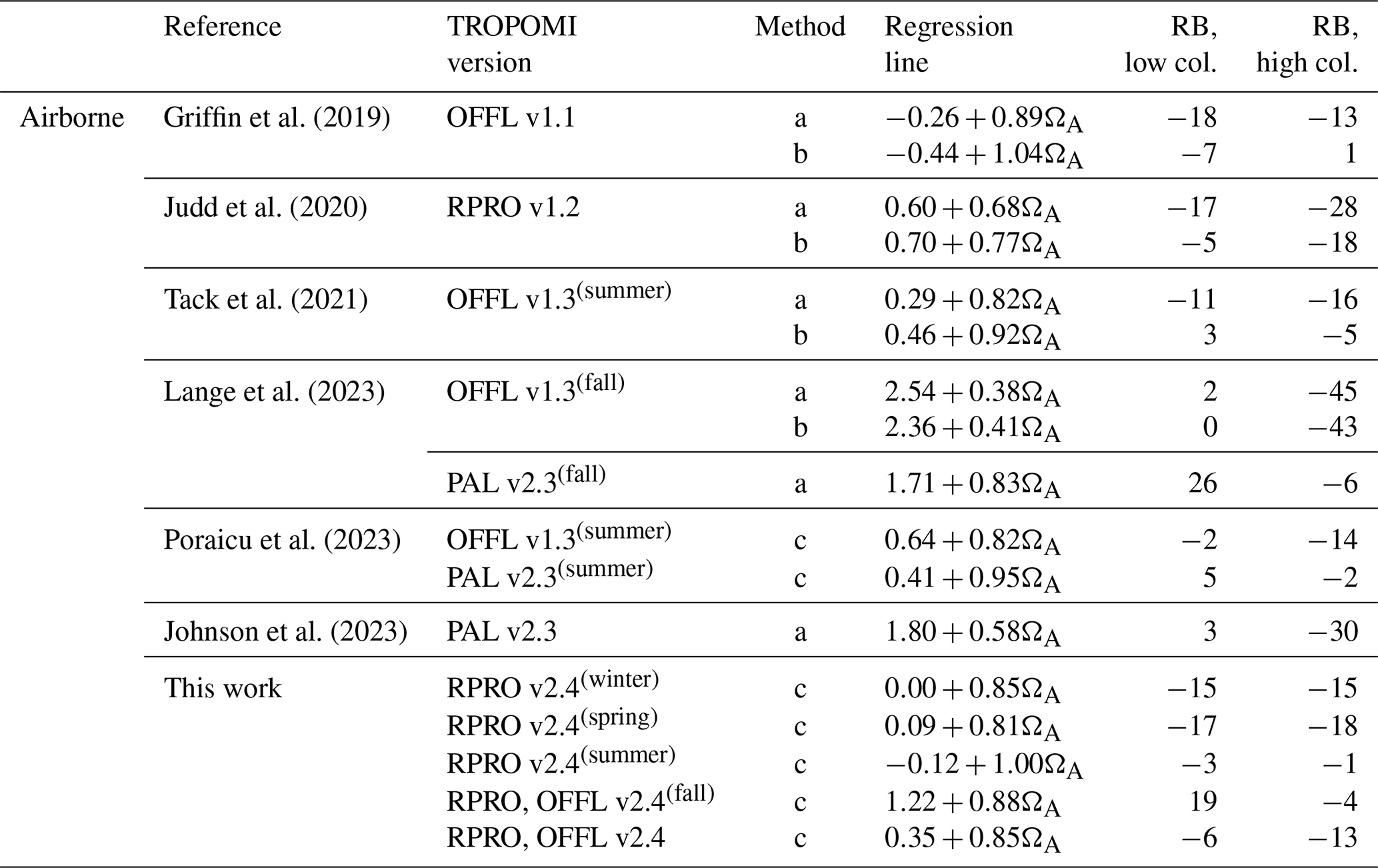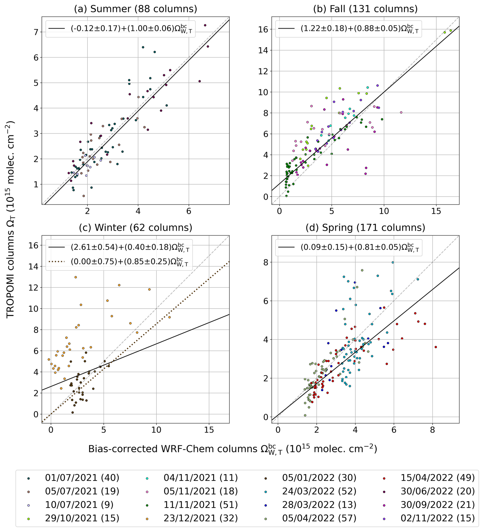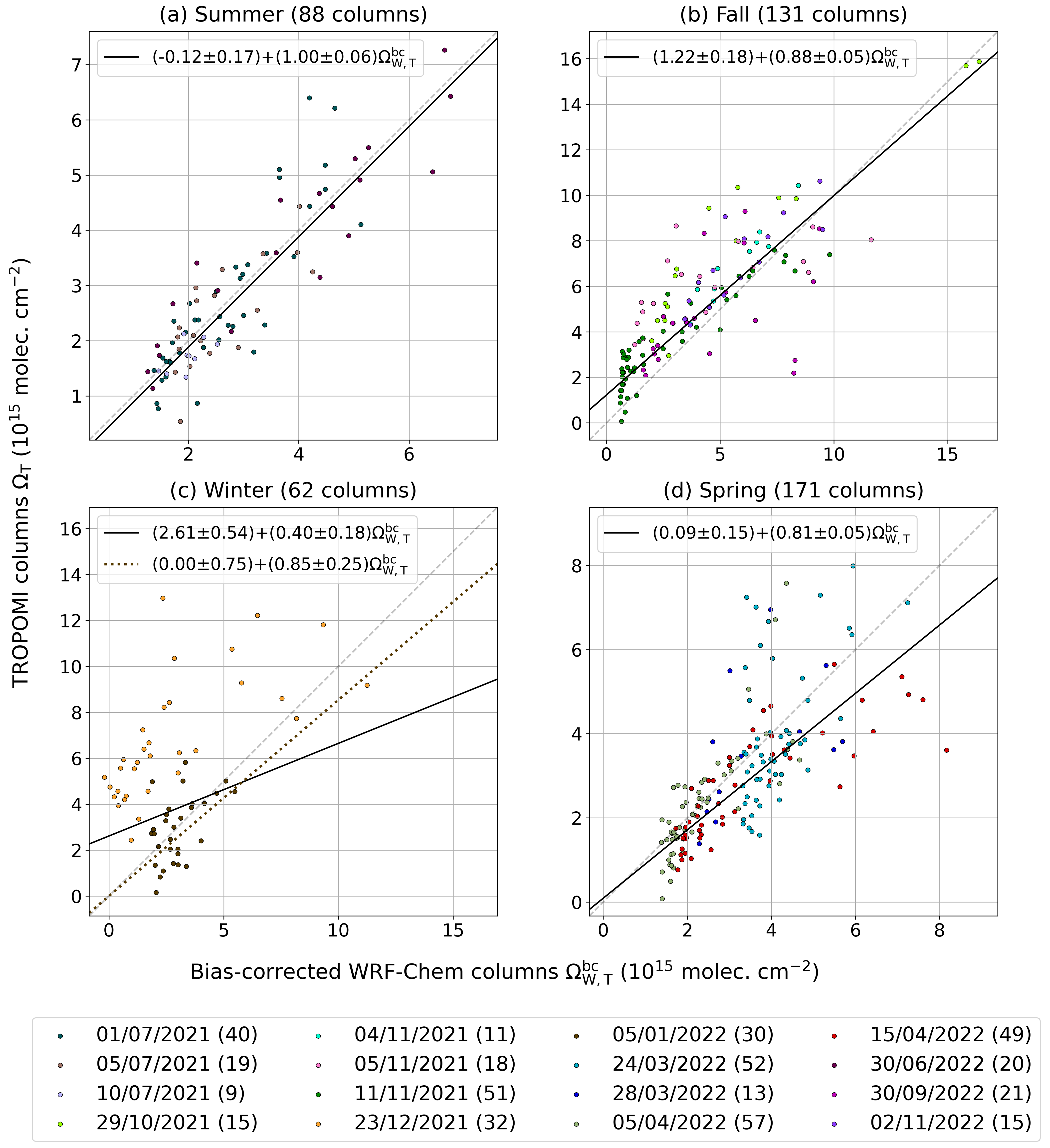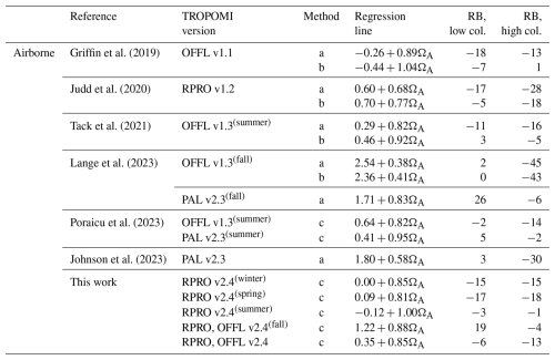 and correct these columns based on the biases evaluated in the first step. The bias-corrected version of ΩW,T columns, denoted by , then serve as a reference to evaluate the bias of TROPOMI, combining data from different flight days, either all together or by season.