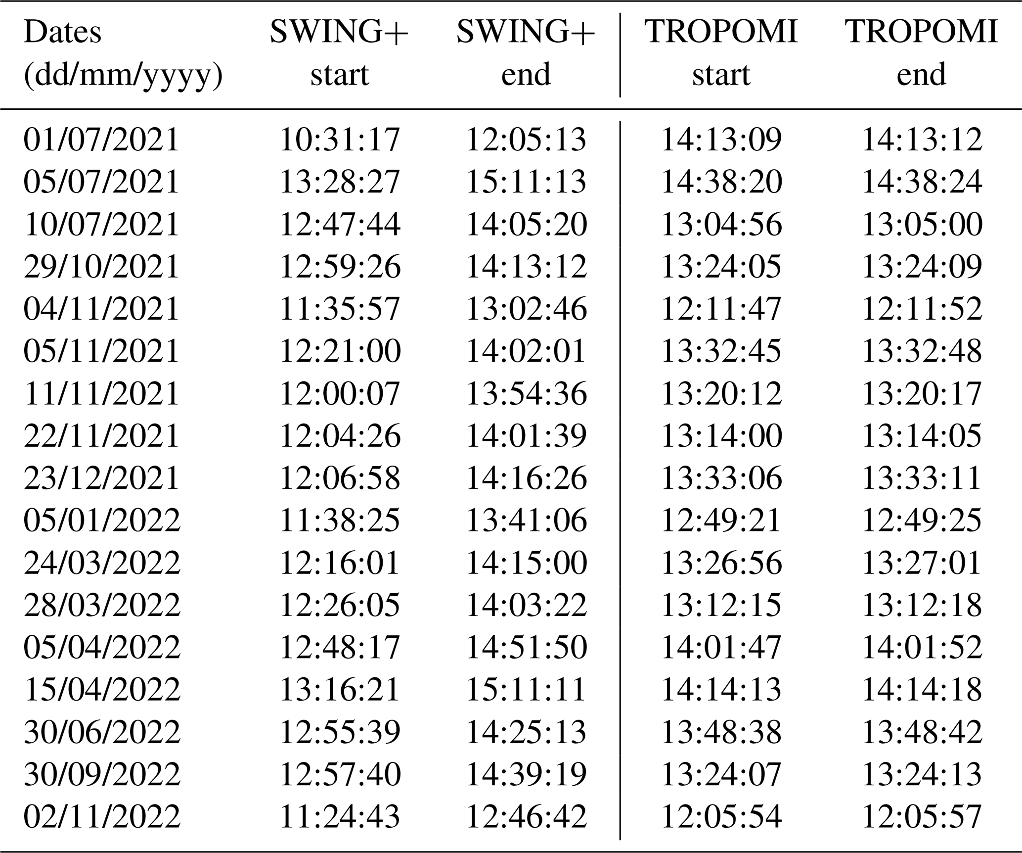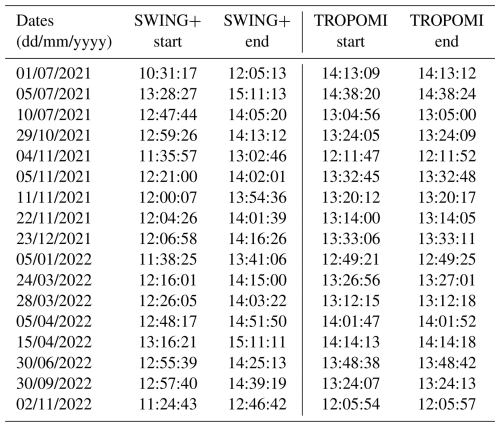 Table 1Acquisition start and end times (local time) of the SWING+ and TROPOMI instruments for each flight date over Bucharest.
