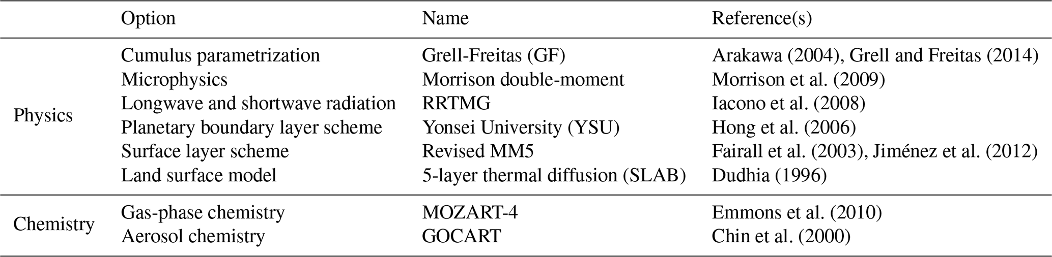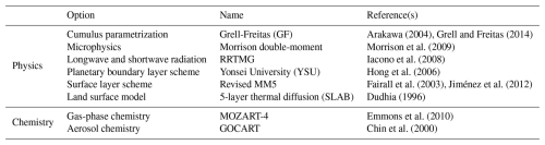 Arakawa (2004)Grell and Freitas (2014)Morrison et al. (2009)Iacono et al. (2008)Hong et al. (2006)Fairall et al. (2003)Jiménez et al. (2012)Dudhia (1996)Emmons et al. (2010)Chin et al. (2000)2.1.2 Emissions