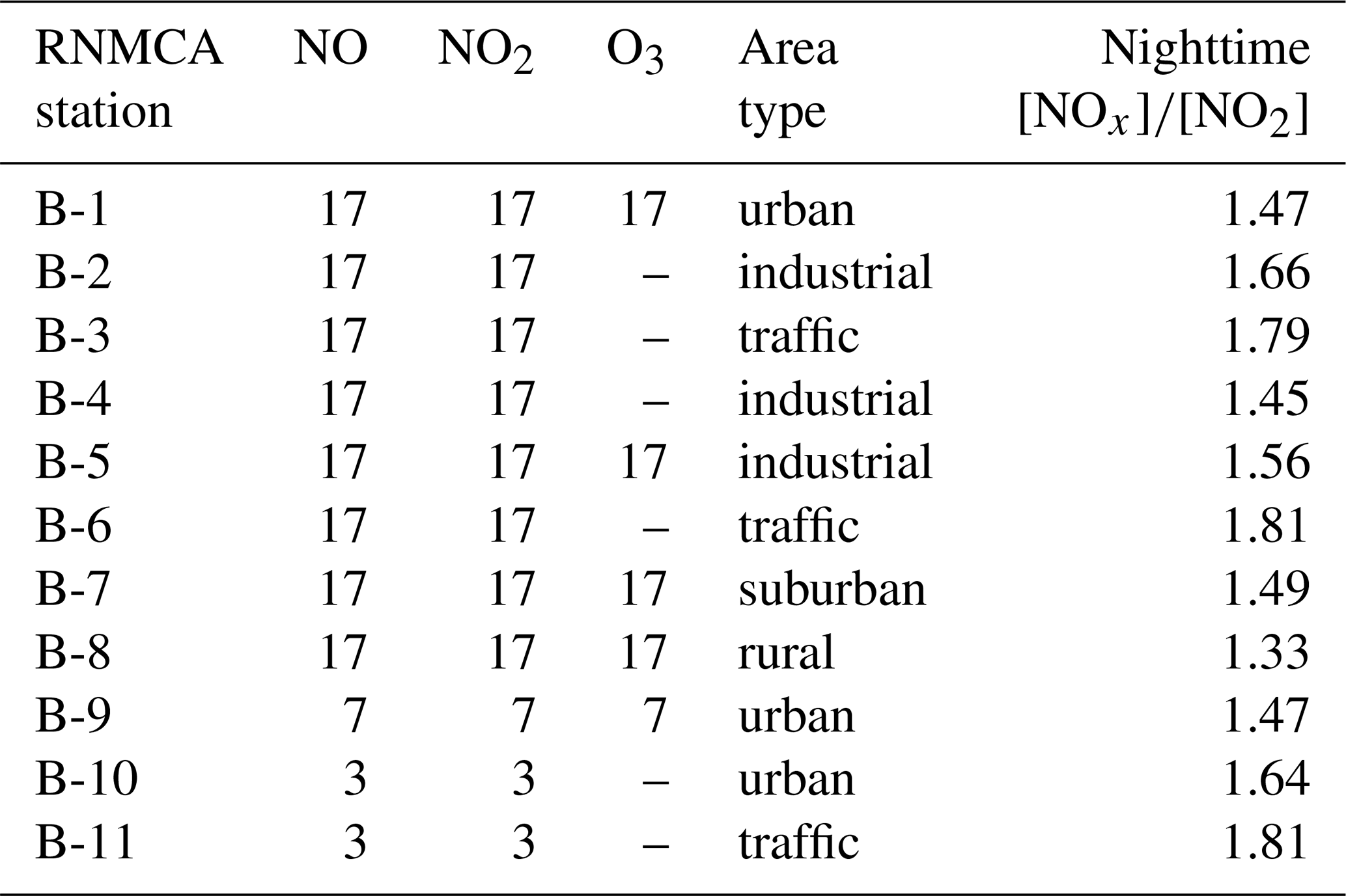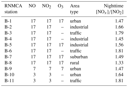 where J is the photolysis rate of NO2, molec.−1 cm3 s−1 (at 298 K) is the rate constant for the titration of O3 with NO (Burkholder et al., 2019), and the dots represent contributions from peroxy radicals. At night, J becomes negligible, causing the ratio to decrease and approach 1. However, photochemical equilibrium is far from being achieved near NOx pollution sources, which primarily emit NO and lead to observed ratios significantly higher than 1. Thus, we select RNMCA stations with relatively low measured NO ratios (using measured values to represent NO2 in both the numerator and denominator) during nighttime, in order to exclude the least representative stations. As shown in Table 3, stations influenced by traffic exhibit the largest deviations from the PSS prediction, with nighttime ratios greater or equal to 1.79. As expected, the lowest ratio (1.33) is found for the only rural station. For the model evaluation in Sect. 3.1.2, we will focus on the eight stations not directly exposed to traffic, characterized by a nighttime NO ratio below 1.7 (B-1, B-2, B-4, B-5, B-7, B-8, B-9, and B-10). The enhancement of concentrations at traffic stations is not specific to our selected dates but was also observed in yearly averages from 2020 to 2022, as reported by Ilie et al. (2023). Note that this distinction does not affect the analysis of O3 concentrations, as traffic stations do not measure it. Ozone is only monitored at five distinct stations (Table 3).
