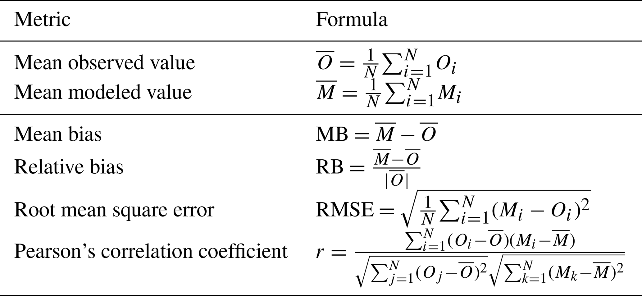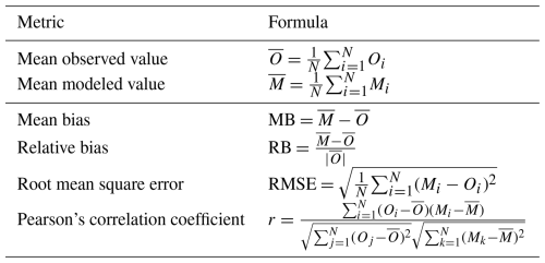Table 4Statistical metrics used to evaluate the model. The formulas are written for N observed values Oi and the corresponding modeled data Mi, with .
