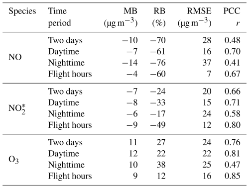 The model generally captures well the diurnal cycle of the measurements. The rush hour peak in the morning and the evening peak in NOx are observed in both the measured and modeled concentrations. As pointed out by Poraicu et al. (2023), a rush hour peak in the late afternoon is not always identifiable, which is expected due to the counterbalancing effects of chemical sink and boundary layer development. The daytime ozone buildup and plateau are well reproduced by the model. Slight delays in these patterns may occur, but the overall correlation is satisfactory. During daytime, we report in Table 5 correlation coefficients of 0.70, 0.71, and 0.81 for NO, , and O3, respectively. Notably, if we restrict the time window to flight hours for , in anticipation of the SWING+ measurements analysis, the correlation increases to 0.80.