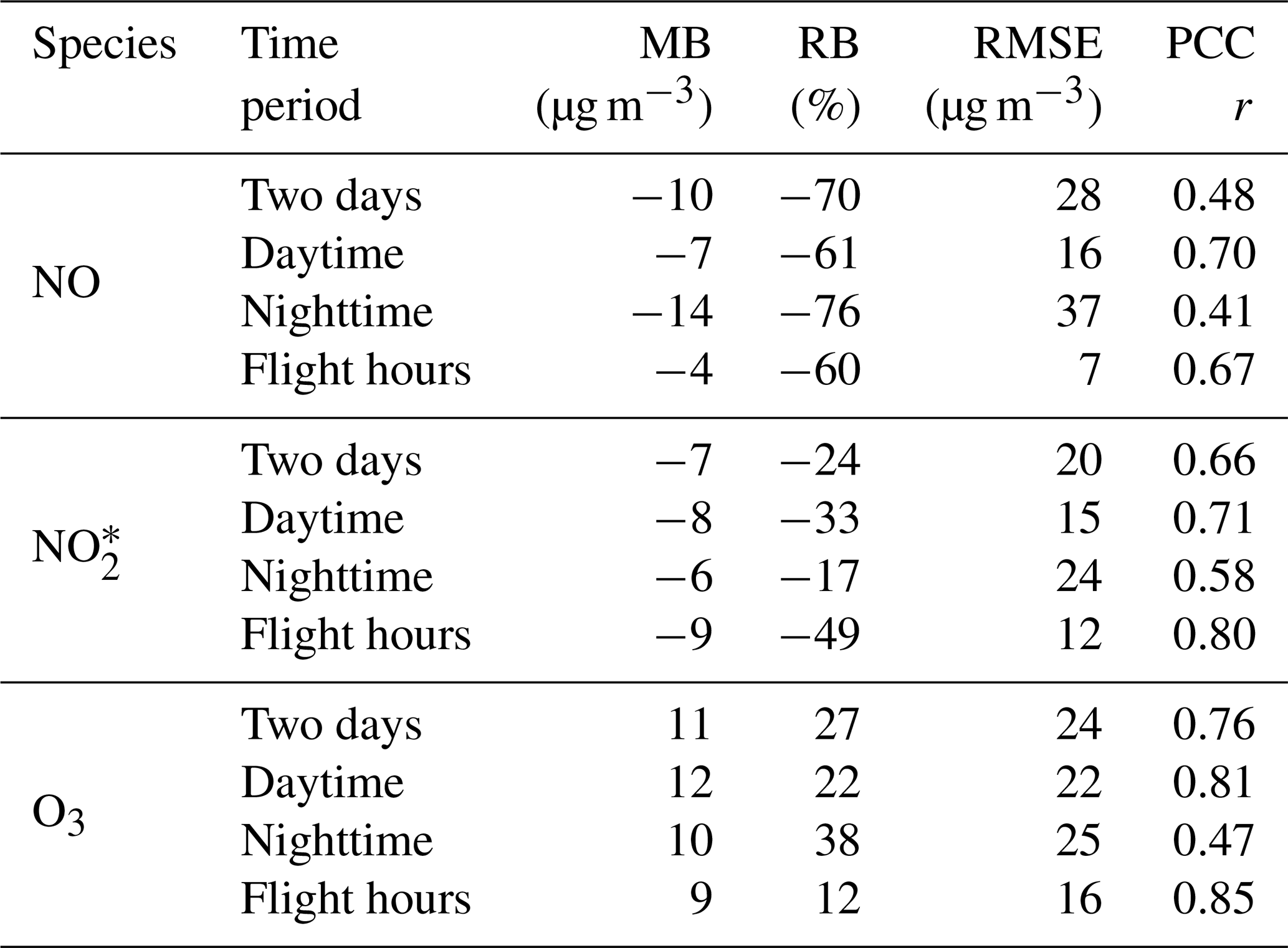 Table 5Statistical metrics calculated for each species and period of the day. Values are obtained from non-traffic RNMCA stations and flight hours refer to the SWING+ acquisition times.