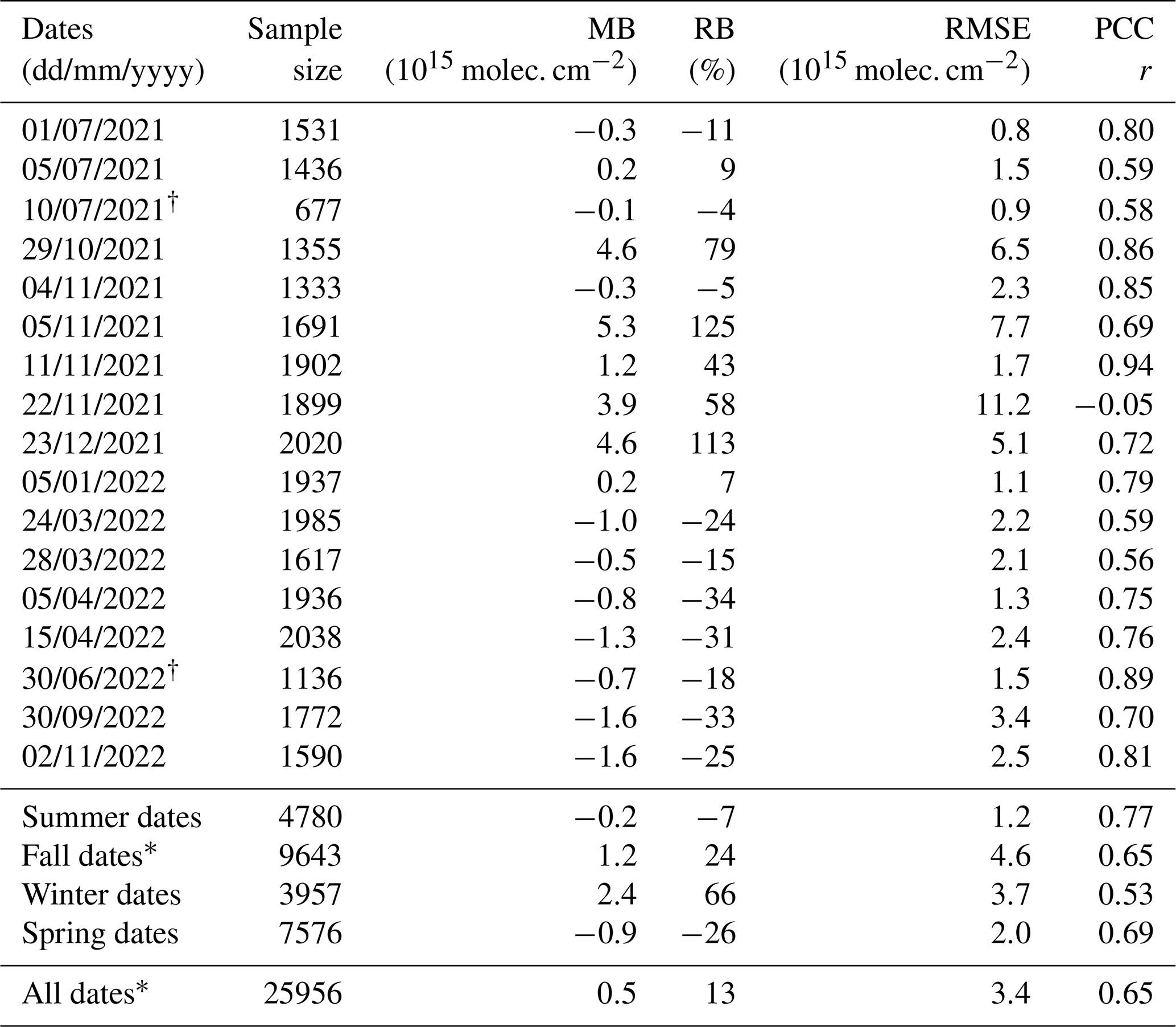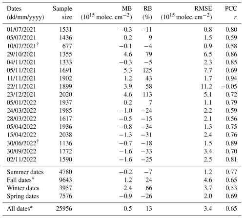 Table 6 presents the evaluation of NO2 columns from WRF-Chem against SWING+ measurements using the statistical metrics from Table 4, for each separate flight. It also provides statistics per season and for the entire dataset. For two dates, namely 10 July 2021 and 30 June 2022, we truncate data associated with the beginning of the flight for reasons explained in Sect. 3.2.2. Inspection of both datasets, conducted independently of each other, indicated that selecting 13:24 LT as the start time was appropriate, instead of the time reported in Table 1. In Sect. S3, Table S4 provides the comparison statistics (similar to Table 6) for runs with and without the factor of 1.5 applied to CAMS-REG v7.0 NOx emissions. Equivalents of Figs. 7 and 8 for the other flight dates, simulated with upscaled emissions, are presented in Sect. S4.