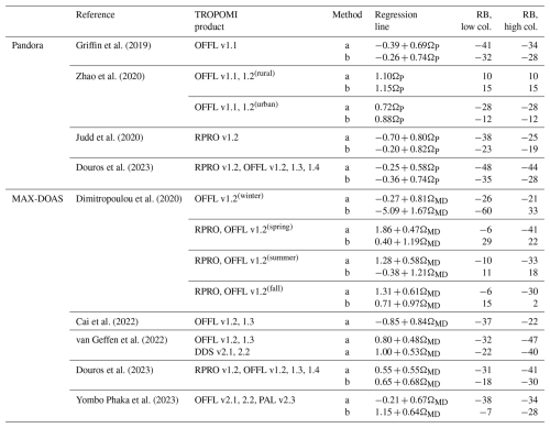 Despite their high relevance, TROPOMI products are subject to limitations and uncertainties arising from the influence of clouds, aerosols, and surface reflection properties on the light path, as well as from uncertainties in the characterization of the a priori vertical profiles of relevant chemical species. Consequently, TROPOMI measurements must be validated against independent observations, preferably with higher spatial and temporal resolution. For instance, the latest Quarterly Validation Report of the S-5P Operational Data Products (Lambert et al., 2025) presents direct comparisons with remote sensing MAX-DOAS instruments globally, showing a positive bias over clean areas (9.5 % for columns below 2 × 1015 molec. cm−2) and a negative bias over highly polluted areas (−38 % for columns above 15 × 1015 molec. cm−2). The overall median bias is −29.4 %, but it can be reduced by about 20 % by smoothing the MAX-DOAS vertical profiles using TROPOMI averaging kernels.
