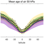 As mentioned in Sect. 2.3, an alternative way to derive the mean meridional overturning circulation that enables direct comparison with satellite data is based on age and the TLP model. This method has a the advantage of being an estimate of the overturning circulation that is independent from the residual circulation mass flux estimate in Fig. 3. On the other hand, there are important caveats associated with this observational estimate, as will be discussed below. Previous studies have shown that the difference in mean age between the tropics and the extratropics in isentropic coordinates is inversely proportional to the mean strength of the overturning circulation, and does not depend on mixing (Linz et al., 2016).