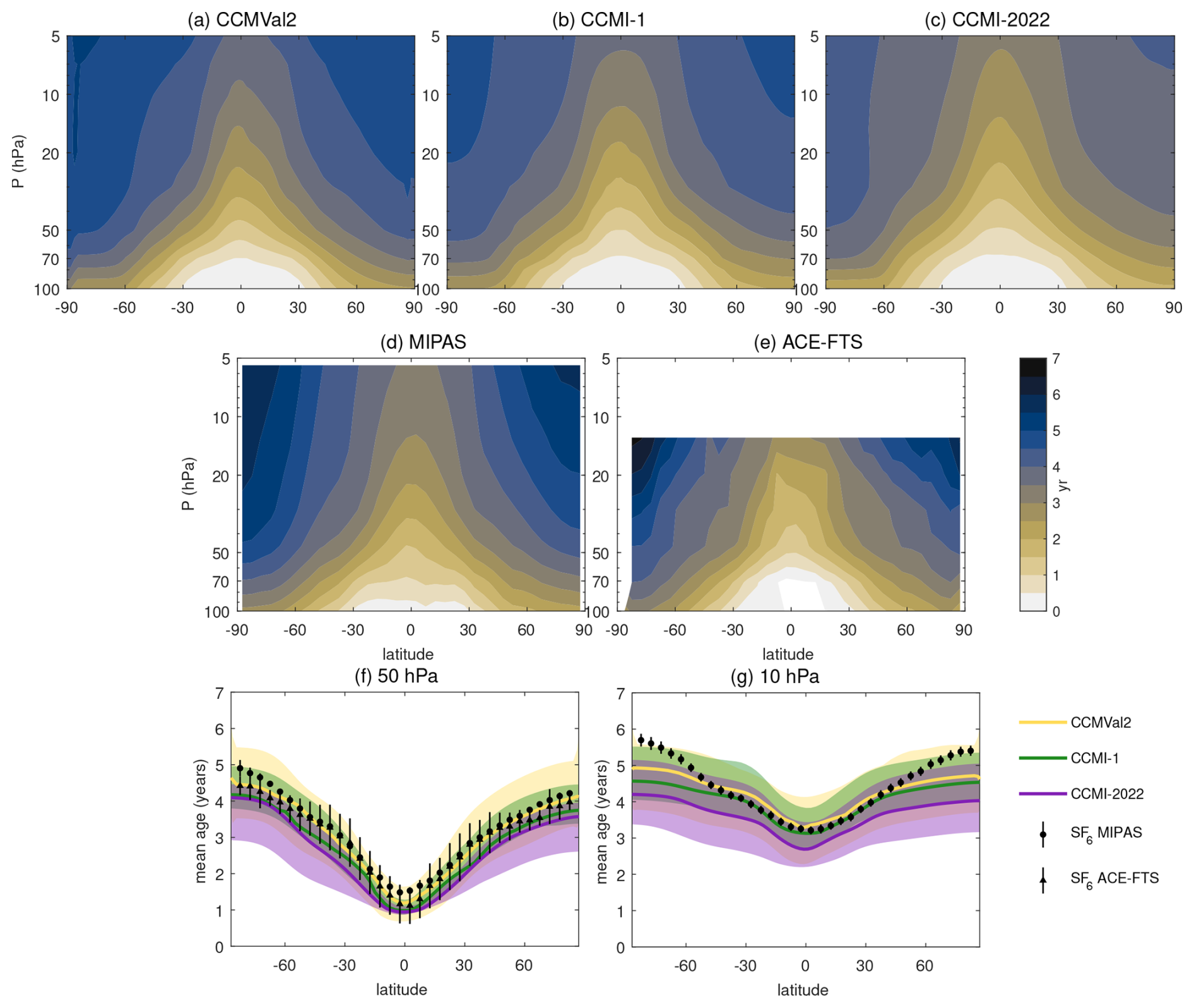 Figure 1(a–e) Cross sections (latitude-pressure) of annual mean AoA multimodel median for CCMVal-2, CCMI-1, and CCMI-2022, and for the observational dataset from MIPAS and ACE-FTS. (f–g) Latitudinal section of the mean age of air from the three generations of models and the satellite estimates at 50 hPa (left) and 10 hPa (right). In all panels the mean age is corrected by removing the value at the equator and 100 hPa of the corresponding dataset.