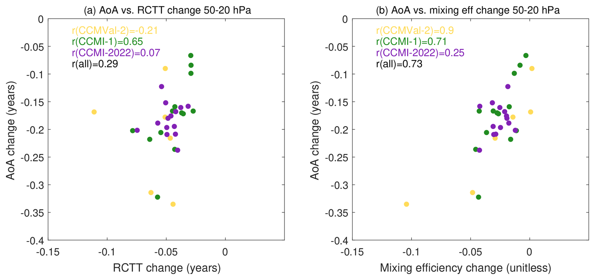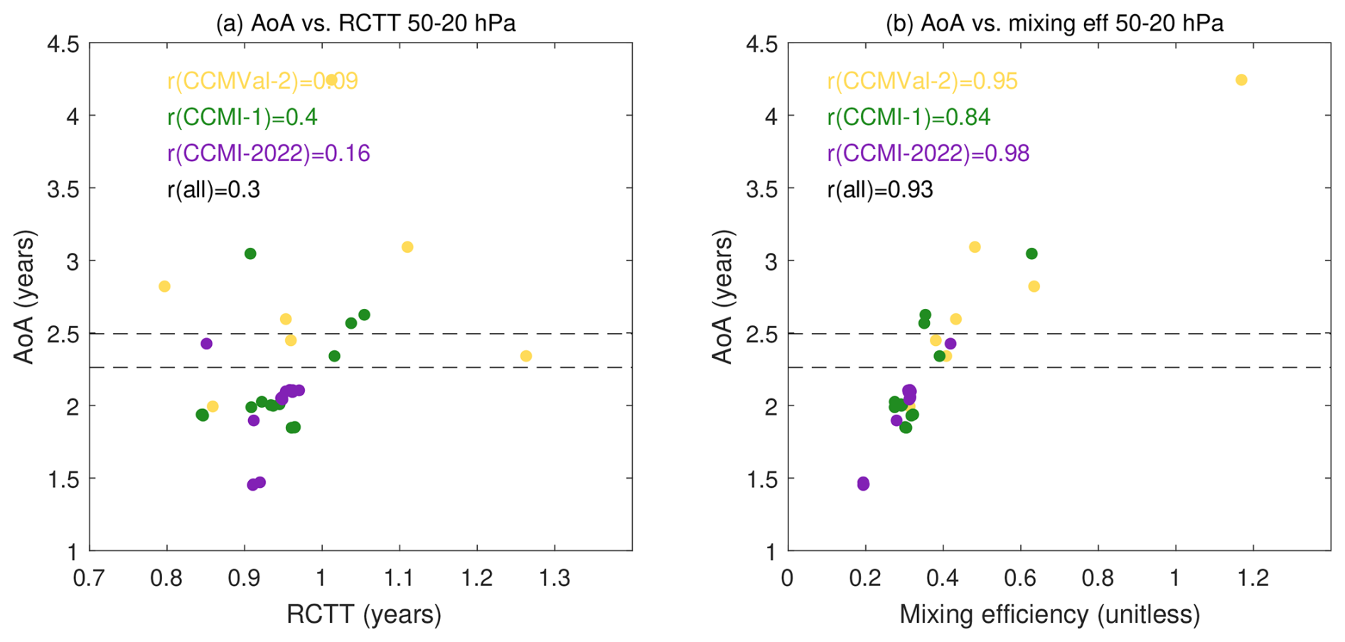 Figure 2 shows the scatter plots of mean AoA versus RCTT and mixing efficiency. Consistent with previous studies, the inter-model spread in AoA is closely related to the spread in mixing efficiency (r=0.93), while the correlation with RCTT is much weaker (r=0.3). This result is robust across model generations and reflects the importance of mixing in determining the climatological mean age simulated by a model, with a relatively small role of the residual circulation strength. In addition, the good correlation of the mean age with mixing efficiency suggests that the models simulating a tropical mean age most similar to the observations also have a more realistic mixing efficiency, while an analogous affirmation cannot be made for RCTT. This could also suggest that the generalized model bias of too young a mean age may be related to a too small mixing efficiency. Notably, the newest model generation (CCMI-2022) exhibits the lowest mixing efficiencies, consistent with its largest bias towards too young mean age of air. A mixing efficiency that is too weak in the lower stratosphere means air does not recirculate as much at those levels, causing a young bias throughout the stratosphere (cf. Neu and Plumb, 1999; Garny et al., 2014; Linz et al., 2021). Nevertheless, we emphasize that these results could also indicate excessive vertical diffusion in the models (Dietmüller et al., 2018).