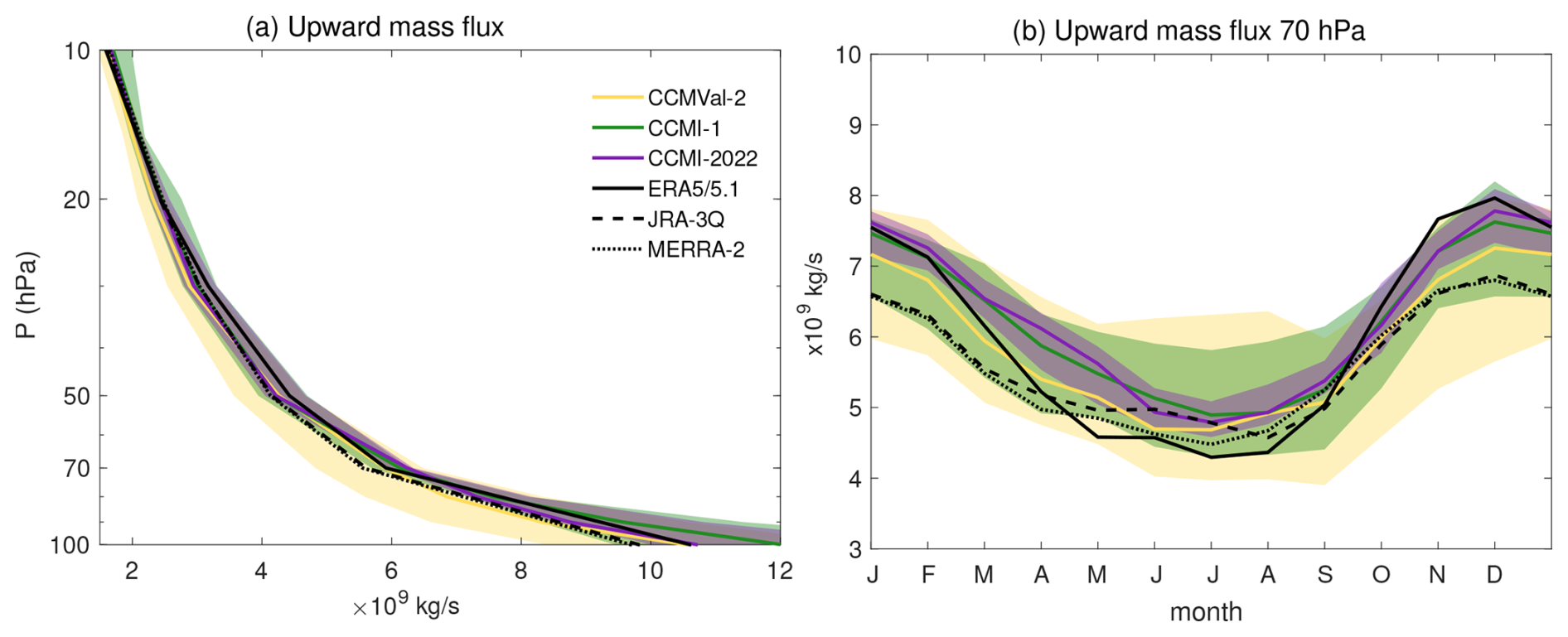 Figure 3Net upward mass flux in the three model generations (MMMed and 15th/85th percentiles) and three reanalyses (ERA5, JRA-3Q, MERRA-2). (a) Annual mean vertical structure (b) seasonal cycle at 70 hPa.