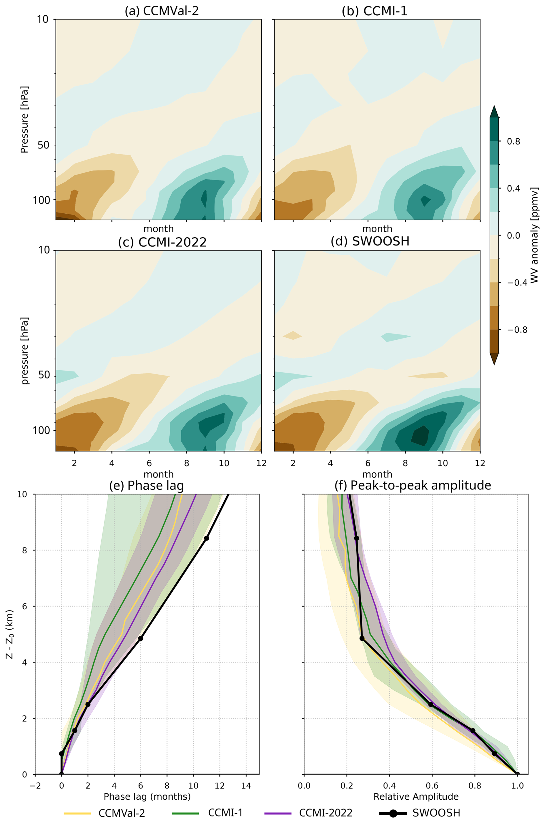 Figure 5(a–d) Water vapor tape recorder signal (20° S–20° N) in tape recorder in CCMVal-2, CCMI-1, and CCMI-2022 multi-model medians and SWOOSH. The time period over which the tape recorder is computed starts in 1992 for all datasets and ends in 2005 for CCMVal-2, 2012 for CCMI-1, and 2018 for CCMI-2022 and SWOOSH. (e–f) phase lag (e) and amplitude (f) as a function of distance from the level of peak tape recorder amplitude.