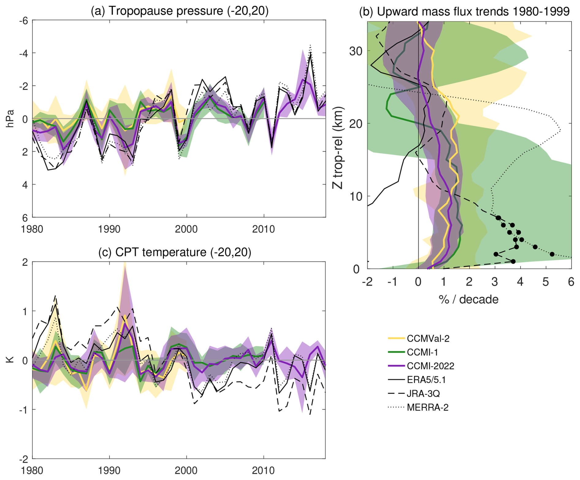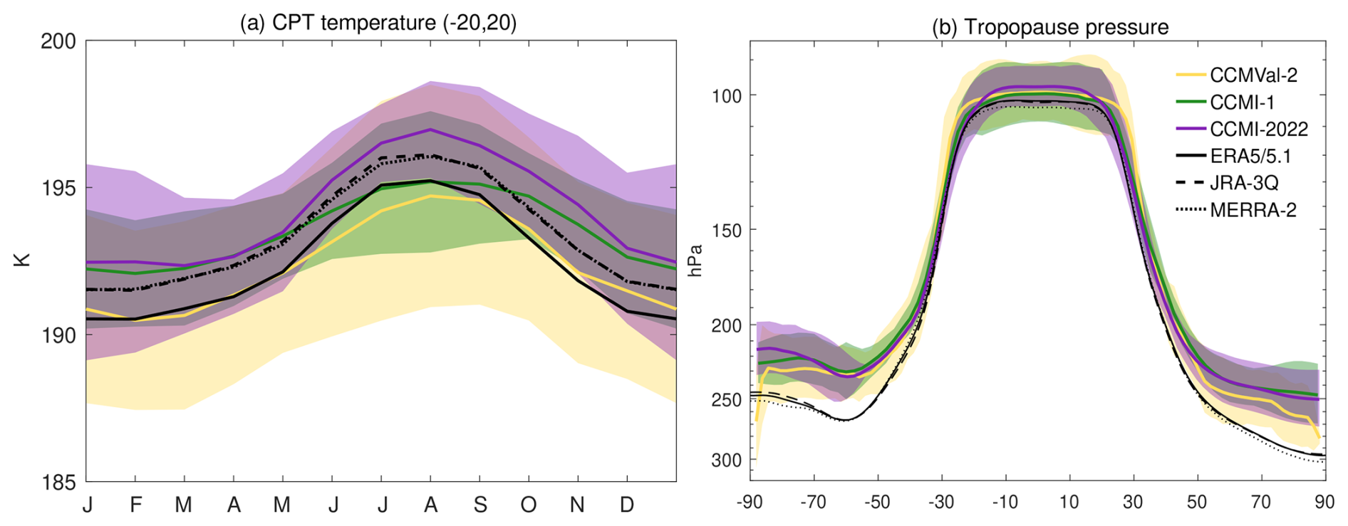 Figure 6(a) Annual cycle of the cold point tropopause temperature averaged over the tropics (20° S–20° N) for the multi-model median and MAD of the three generations and three reanalyses. (b) Annual mean lapse rate tropopause pressure as a function of latitude.